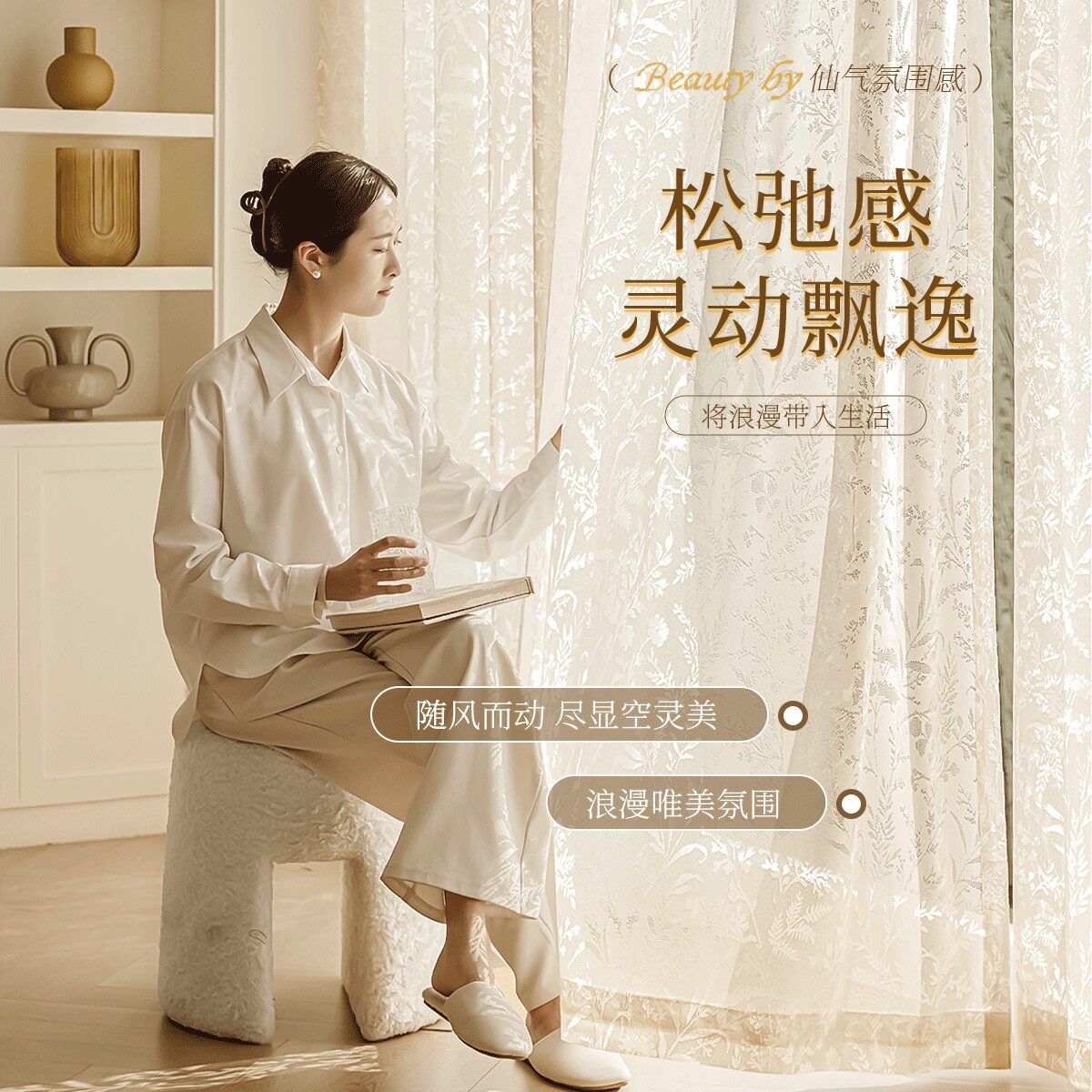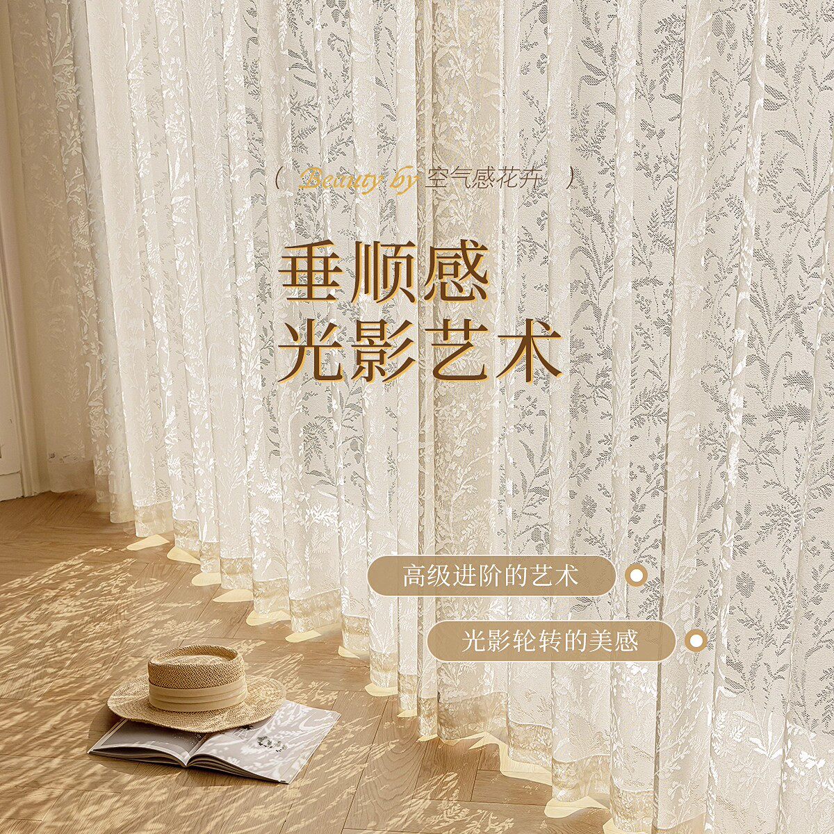法式纱帘窗帘飘窗客厅阳台窗纱透光不透人高档月枝影卧室百叶奶油