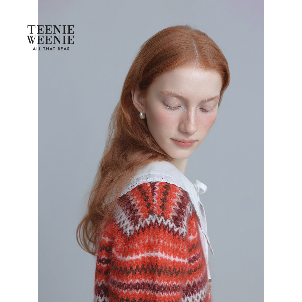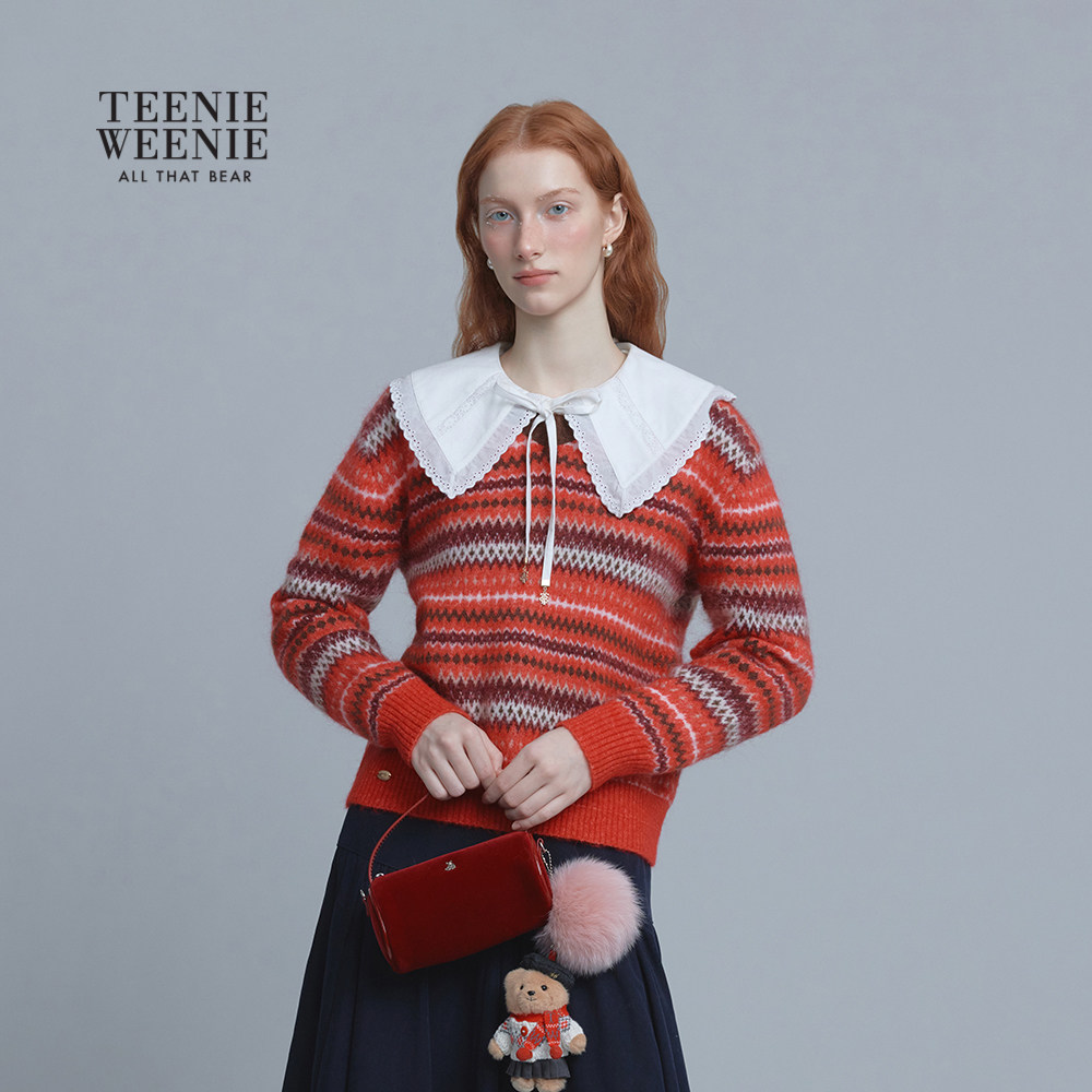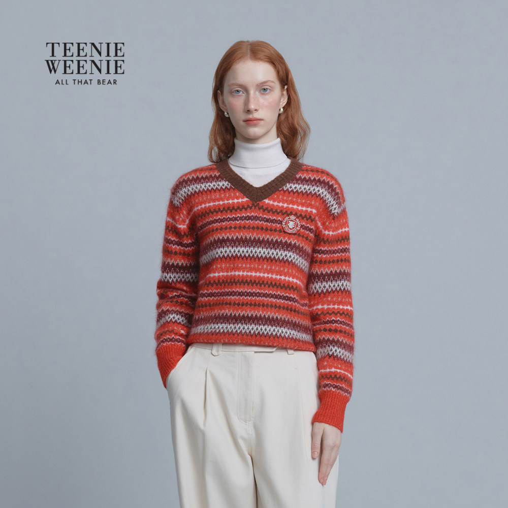 TeenieWeenie小熊女装毛衣25冬新款复古时尚V领提花套头毛针织衫