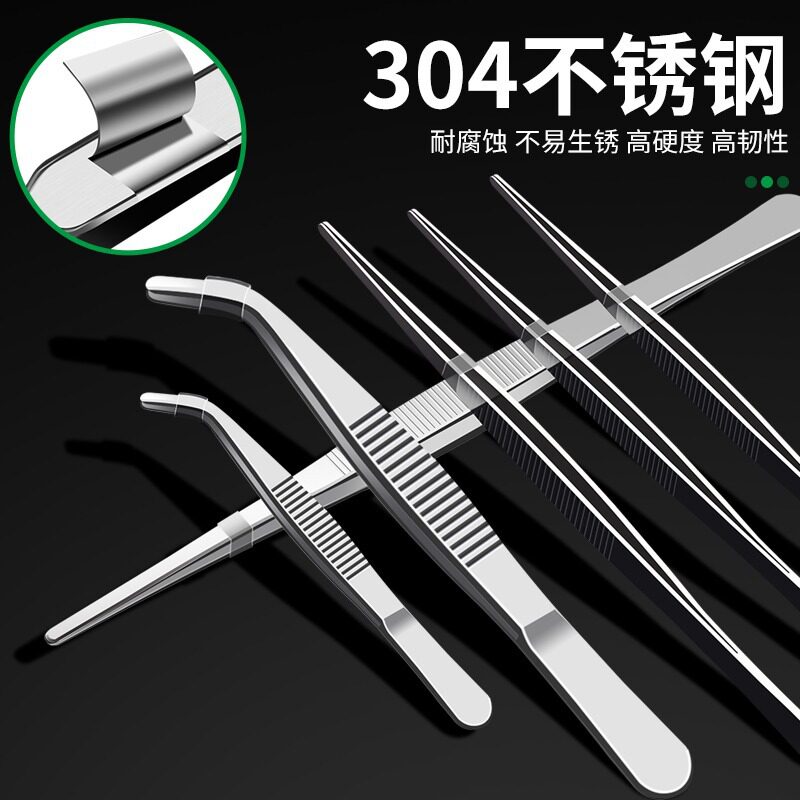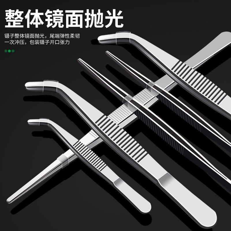304不锈钢镊子弯头敷料鱼缸水草工具维修夹子特厚取物带齿防滑
