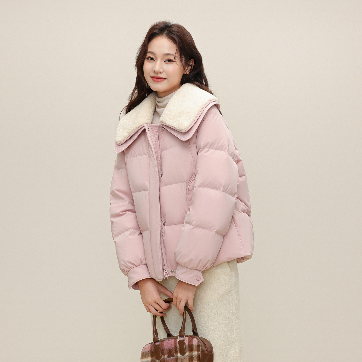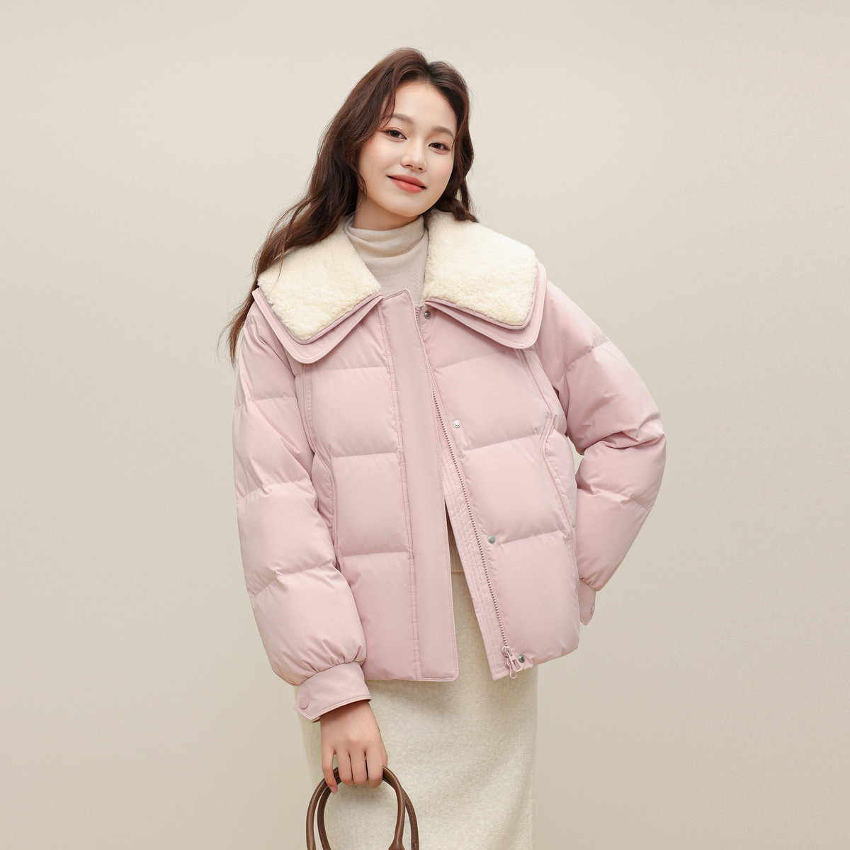 雪中飞2026春新款女士羽绒服短款时尚羊羔毛领拼接休闲韩系学院