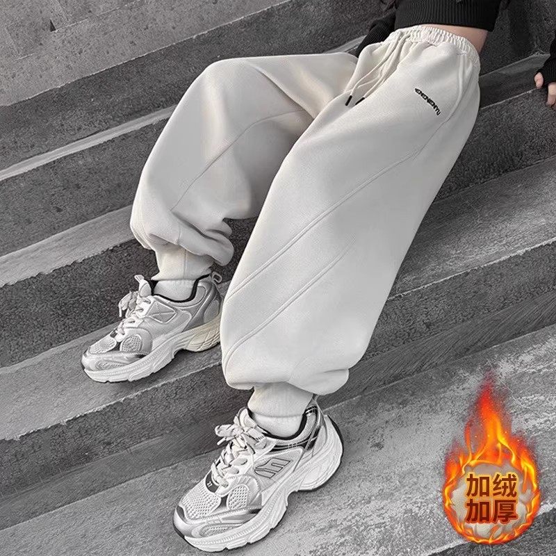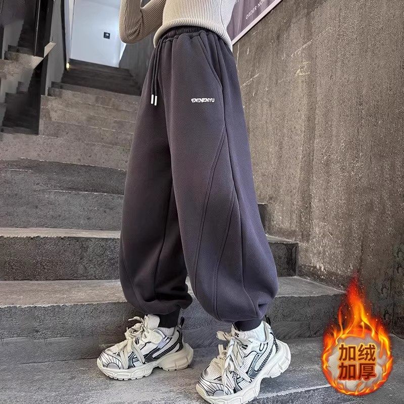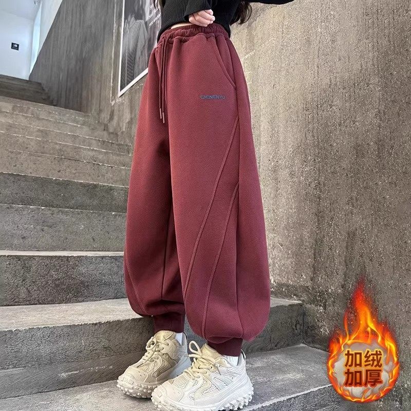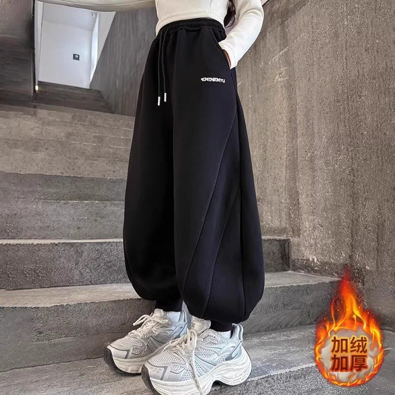 女童加绒裤子秋冬季中大童运动裤女孩洋气百搭宽松一体绒休闲长裤