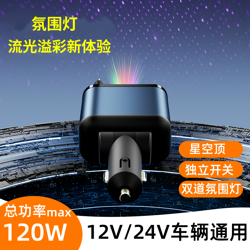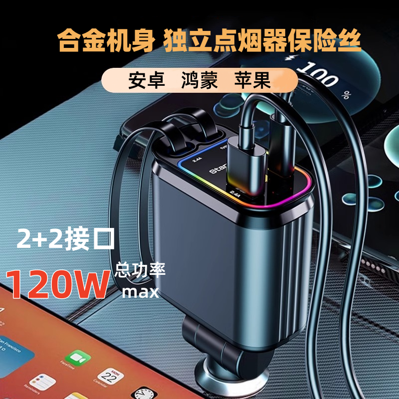 星空顶车载充电器120W手机超级快充伸缩线一拖四点烟器口适用华为