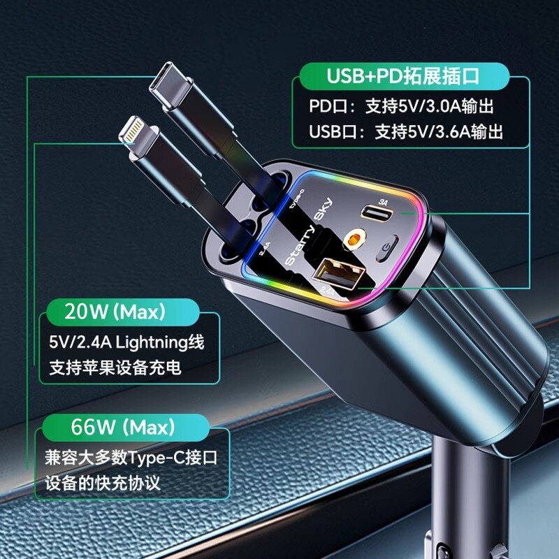 车载充电器超级快充720W带伸缩线适用苹果华为汽车点烟器转换插头