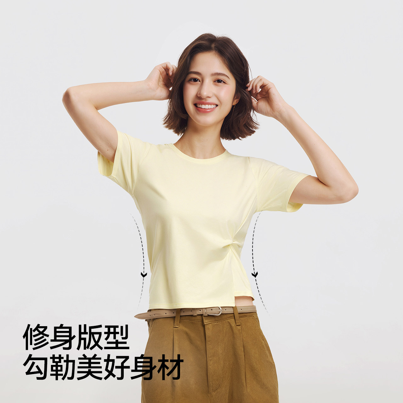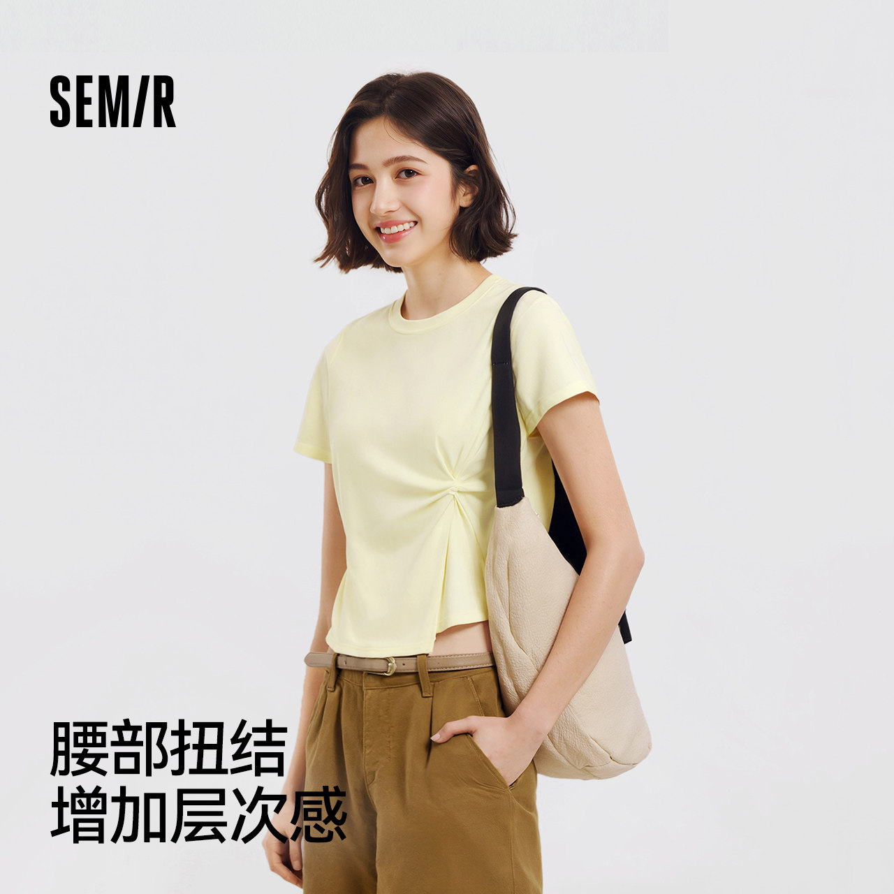 陈都灵|森柔|森马短袖T恤女夏短款正肩纯色修身扭结不对称上衣