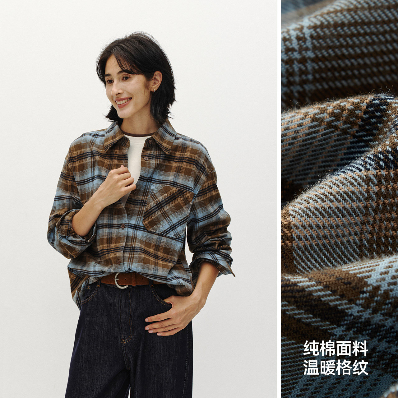 商场同款|森马长袖衬衫女冬中长款磨毛纯棉格子宽松2025新款衬衣