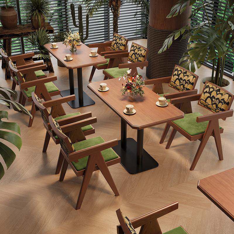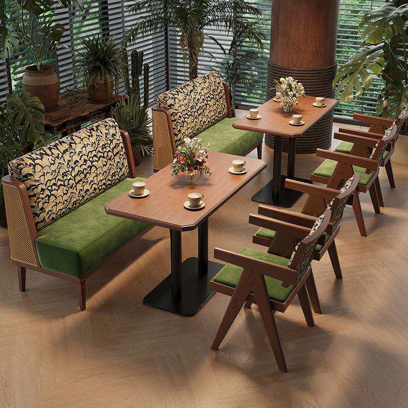 东南亚餐厅桌椅组合甜品店实木编藤卡座复古咖啡厅连锁饭店餐桌椅
