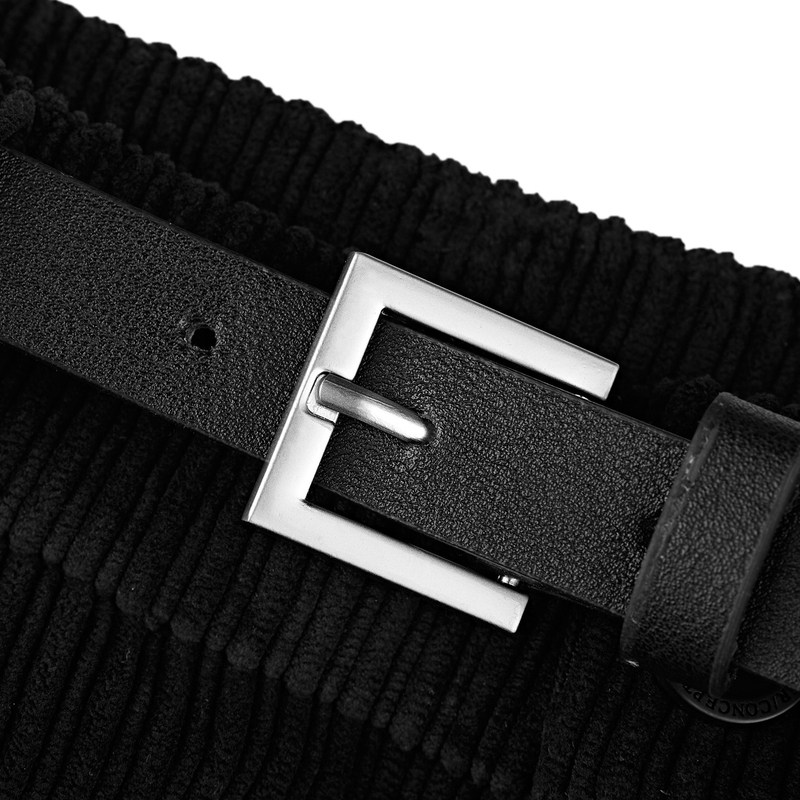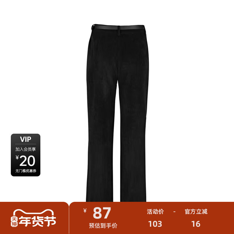sdeer圣迪奥女装复古腰带压褶肌理灯芯绒黑色长裤S21460812