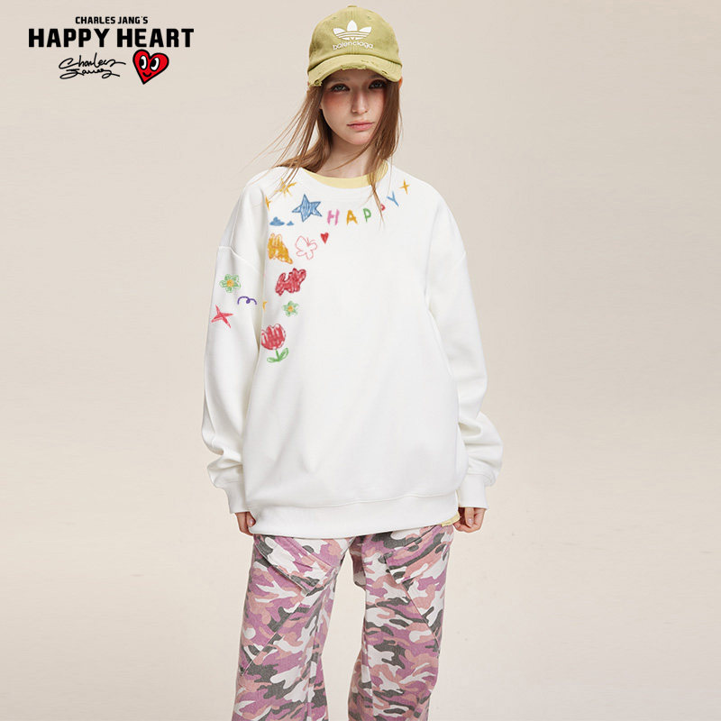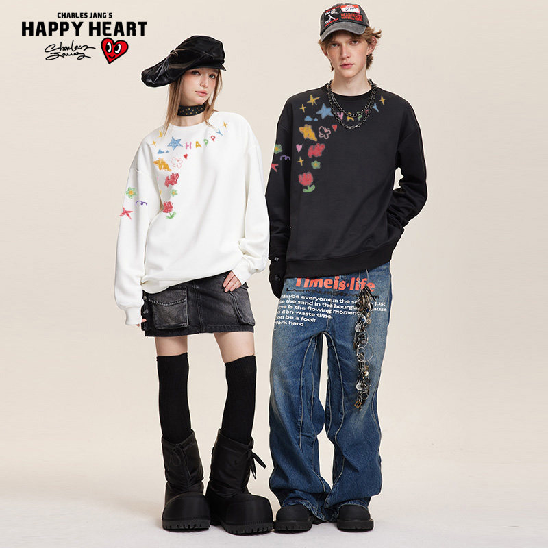 查尔斯桃心圆领卫衣蜡笔画印花云感双面超柔面料男女同款情侣百搭