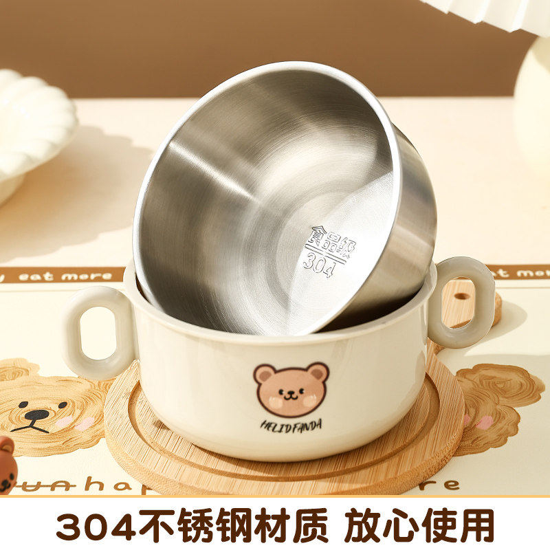 儿童辅食碗餐具套装吃饭带手柄防摔防烫牛奶杯碗勺叉不锈钢带盖
