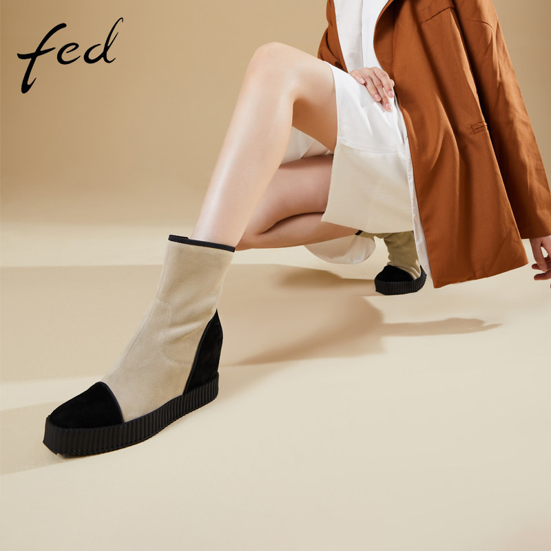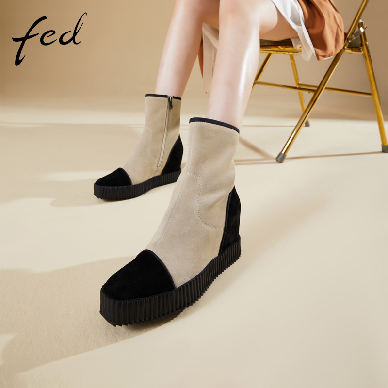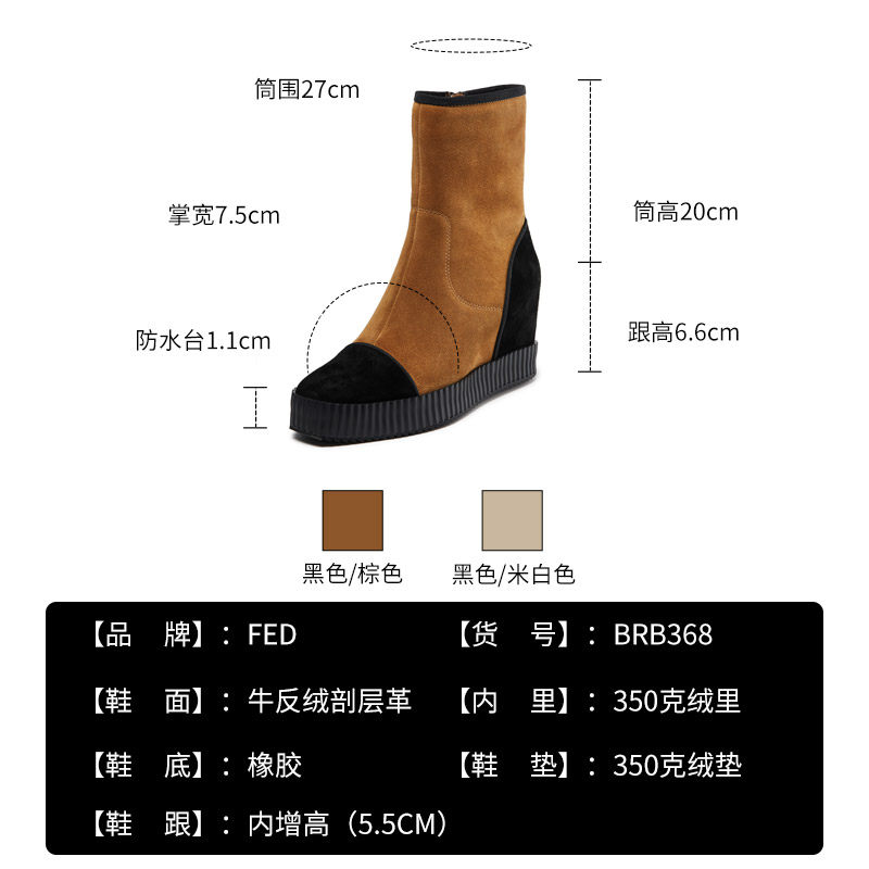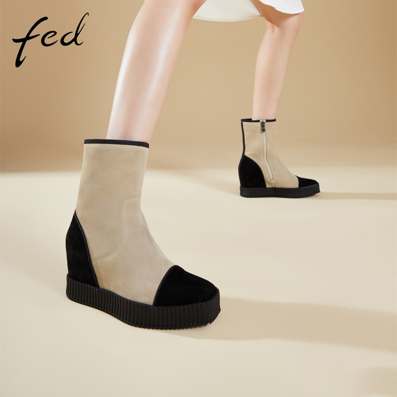 fed坡跟短靴冬季新款加绒靴子百搭拼接侧拉链瘦瘦靴女1130-ZF368