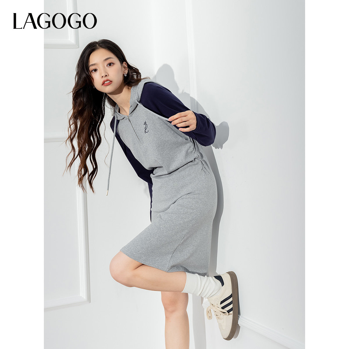 LAGOGO撞色插肩袖时尚连衣裙女拉谷谷2025秋冬新款T恤连帽裙子