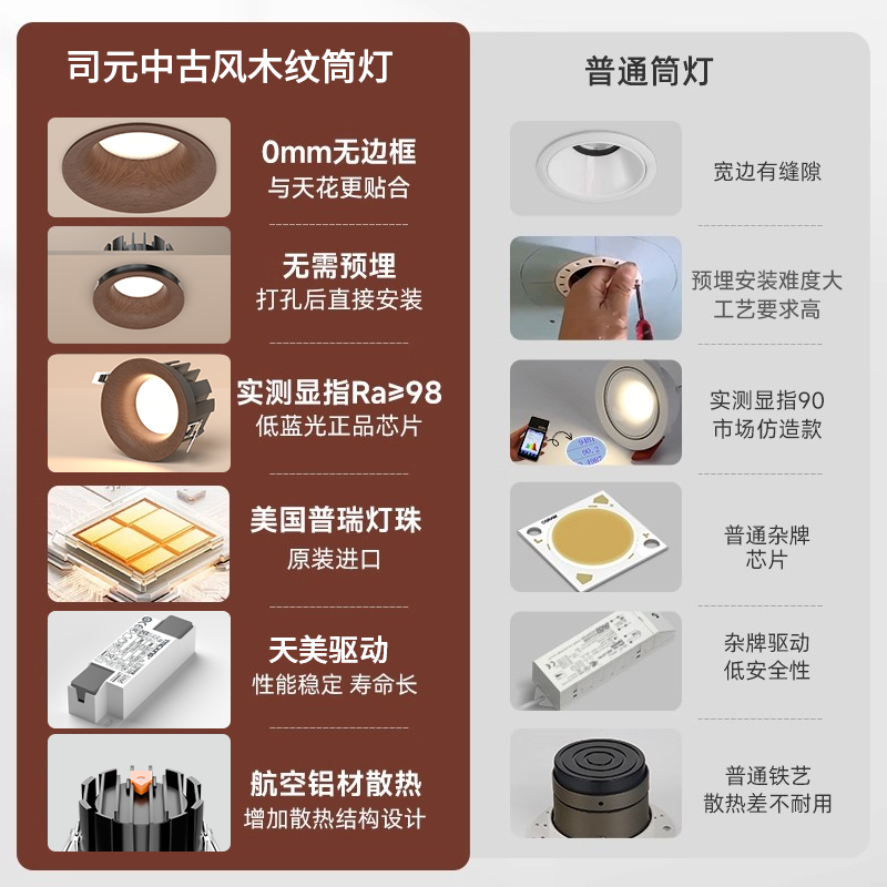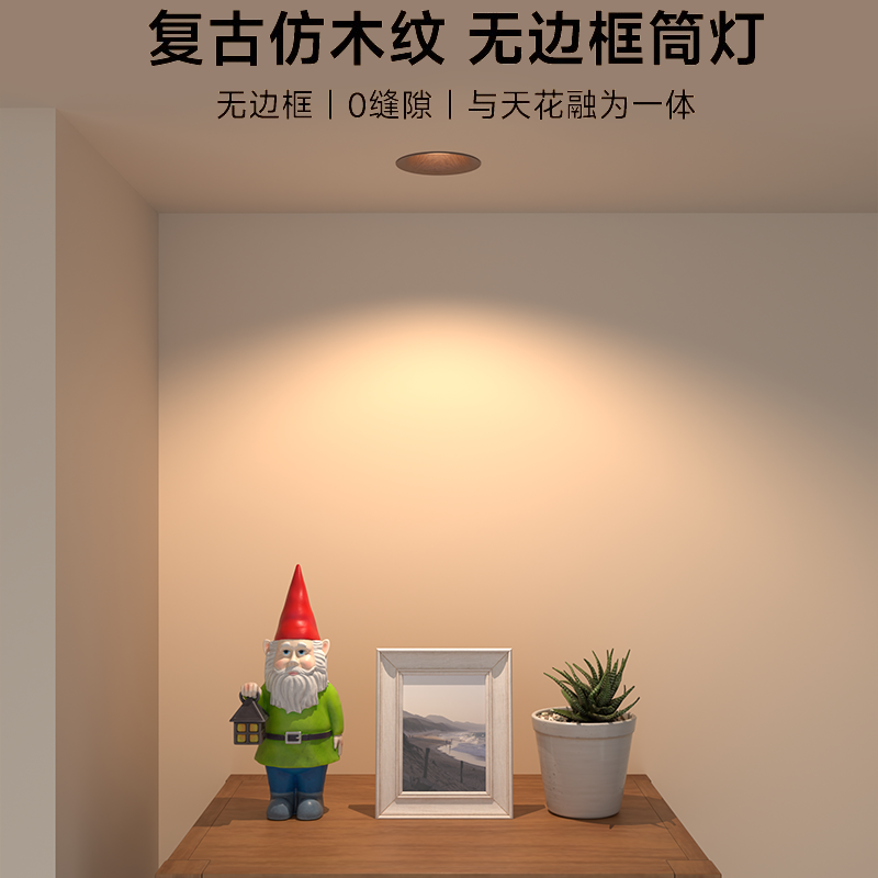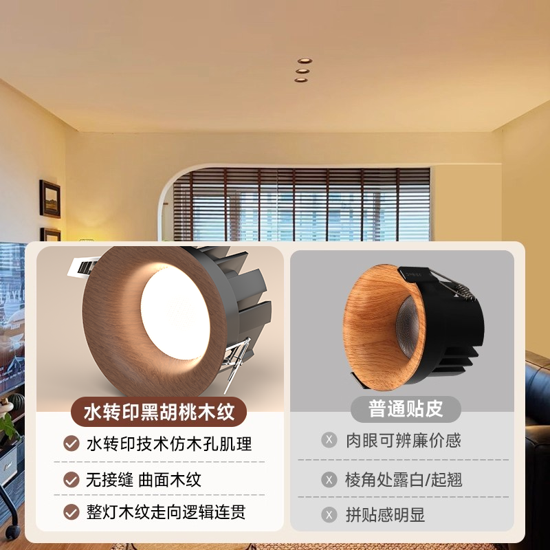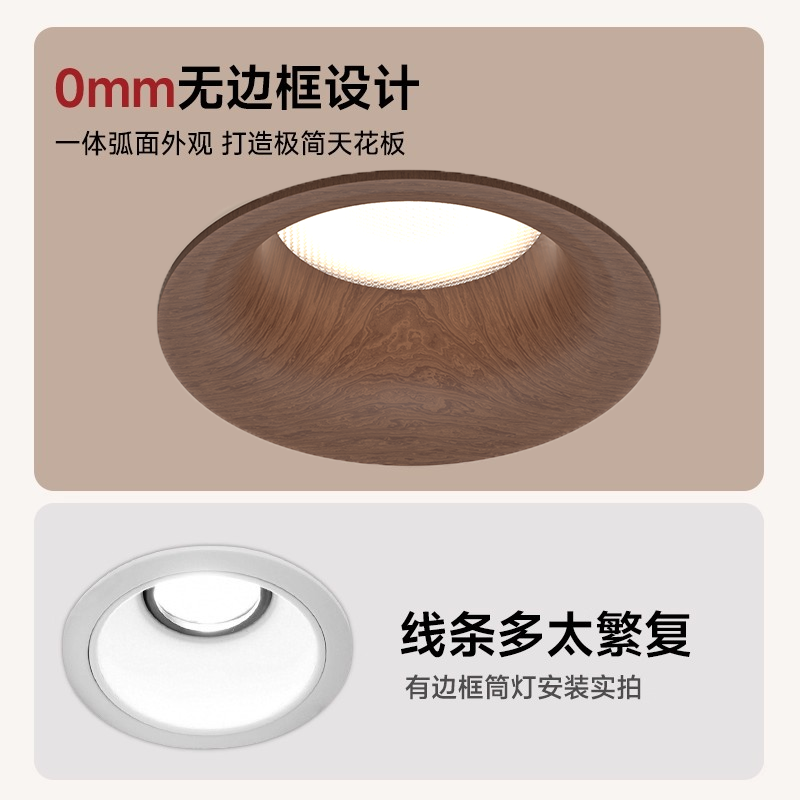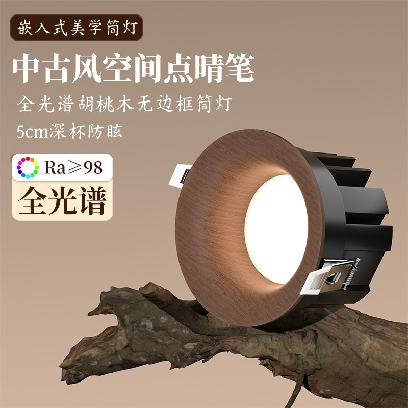 中古风胡桃木纹嵌入式无边框筒灯开孔75mm家用客厅玄关深防眩筒灯