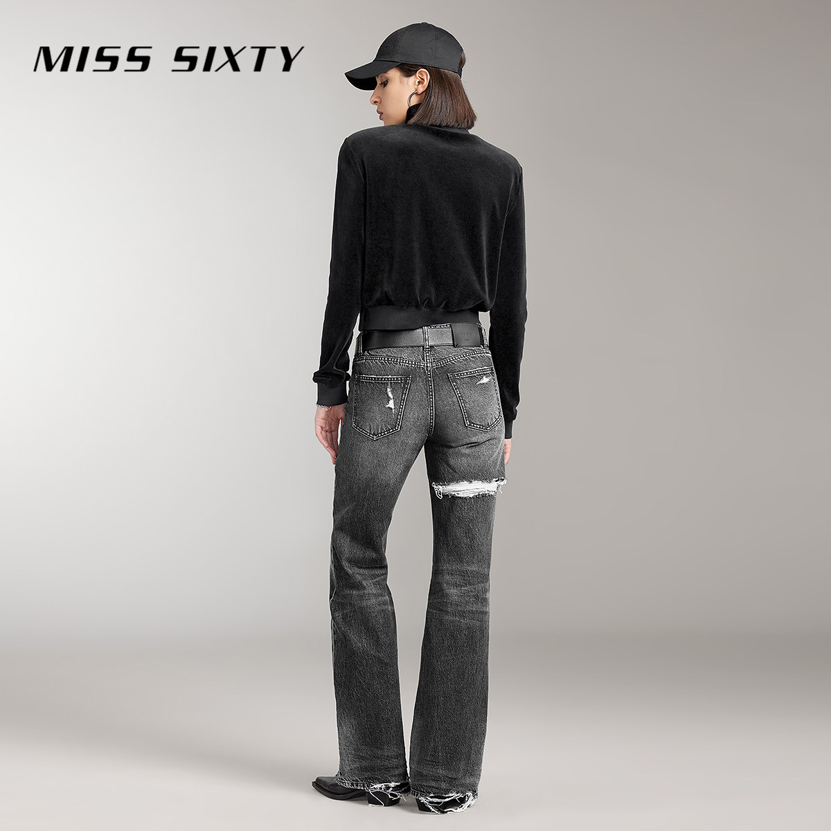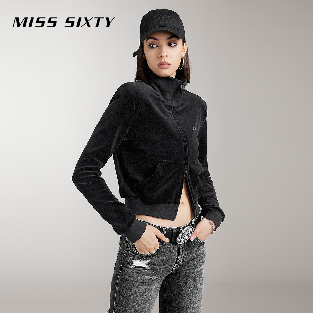 Miss Sixty丝绒休闲外套女翻领短款复古运动风百搭长袖双向拉链
