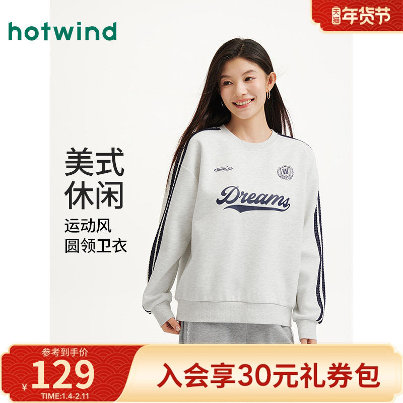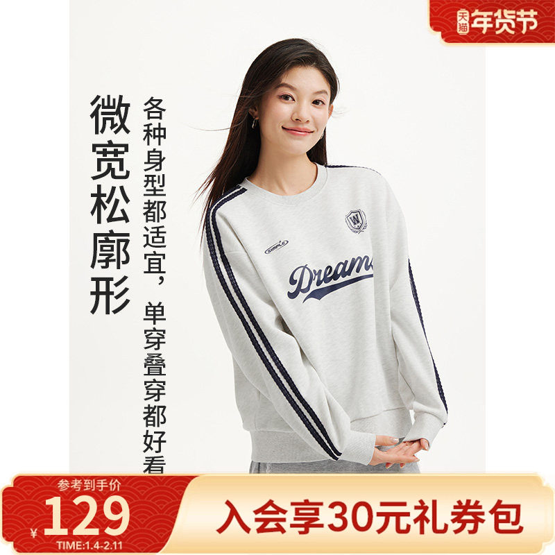 热风2026年春季新款女士运动风圆领卫衣宽松藏肉学院风徽标点缀