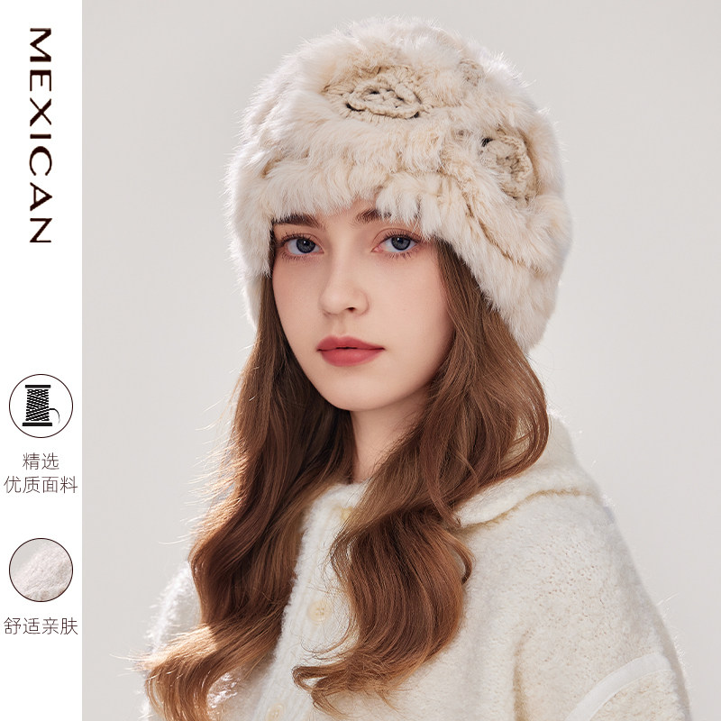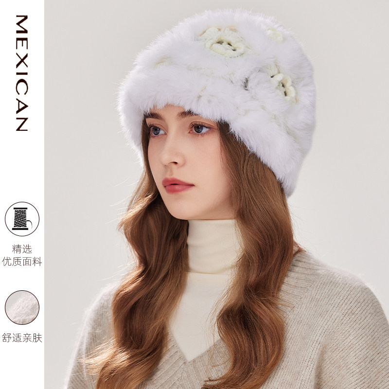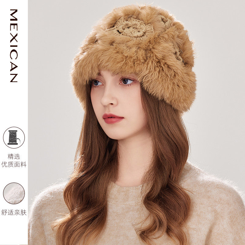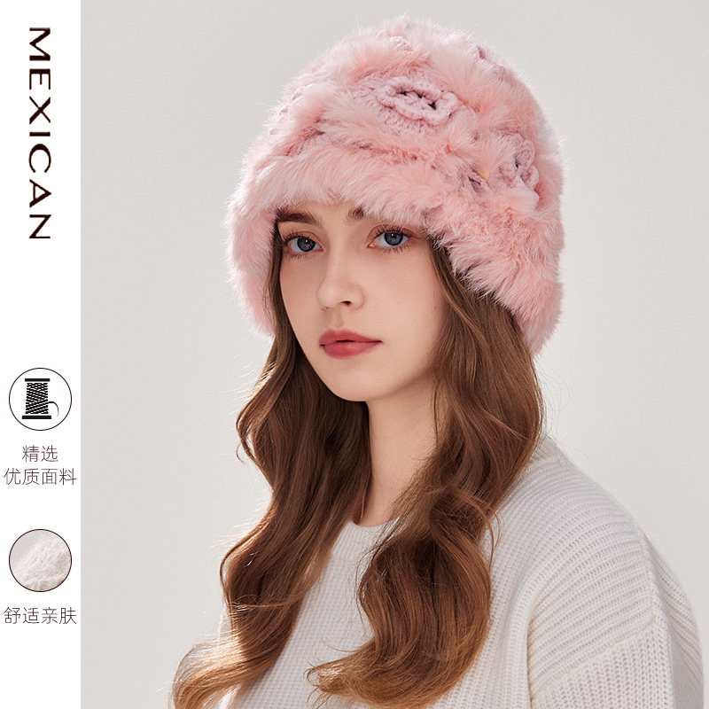 稻草人仿兔毛皮草帽子女冬季保暖渔夫帽手工钩针花朵镂空包头冷帽