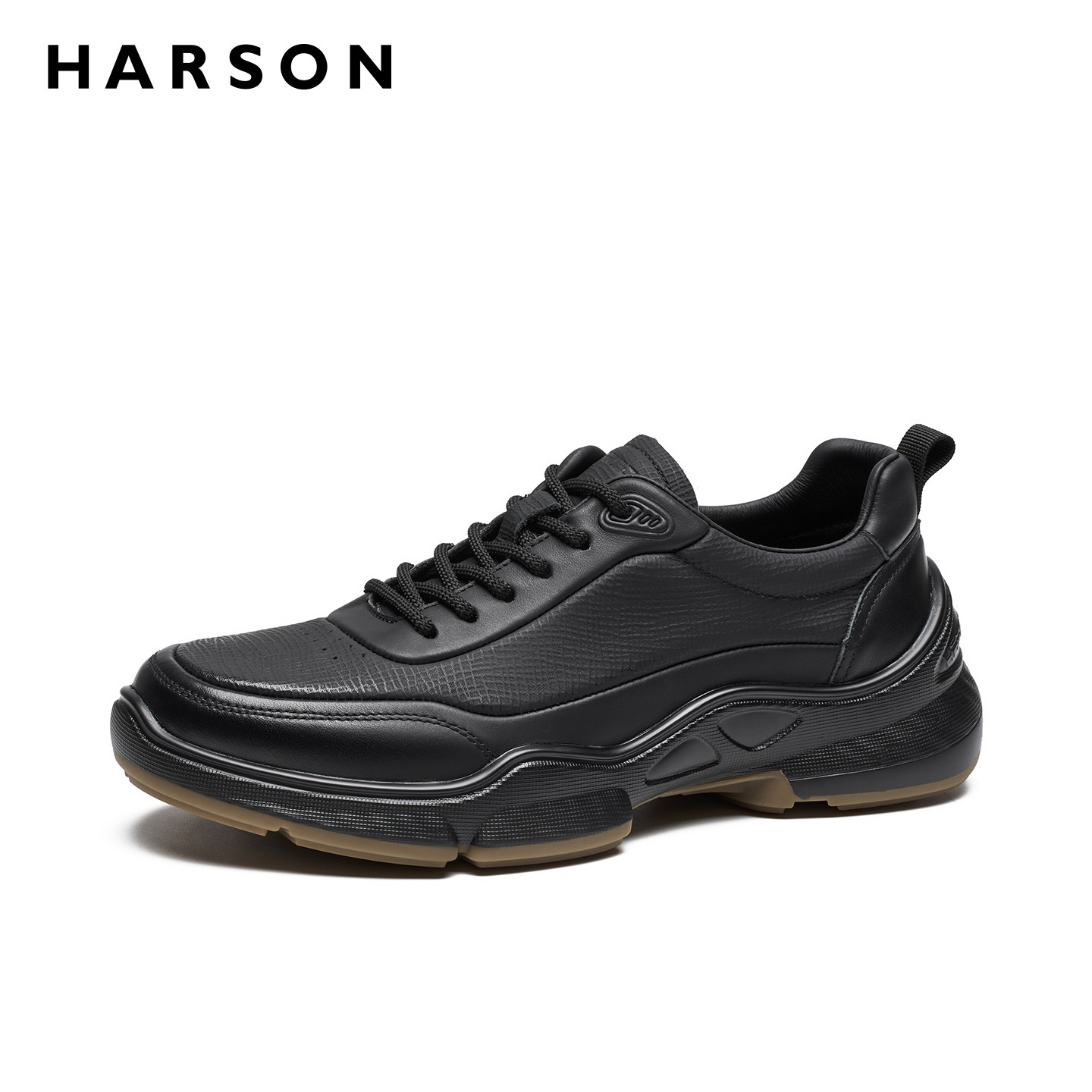 哈森宽脚男鞋秋季新款户外运动休闲鞋男士皮鞋真皮全黑软底公务鞋