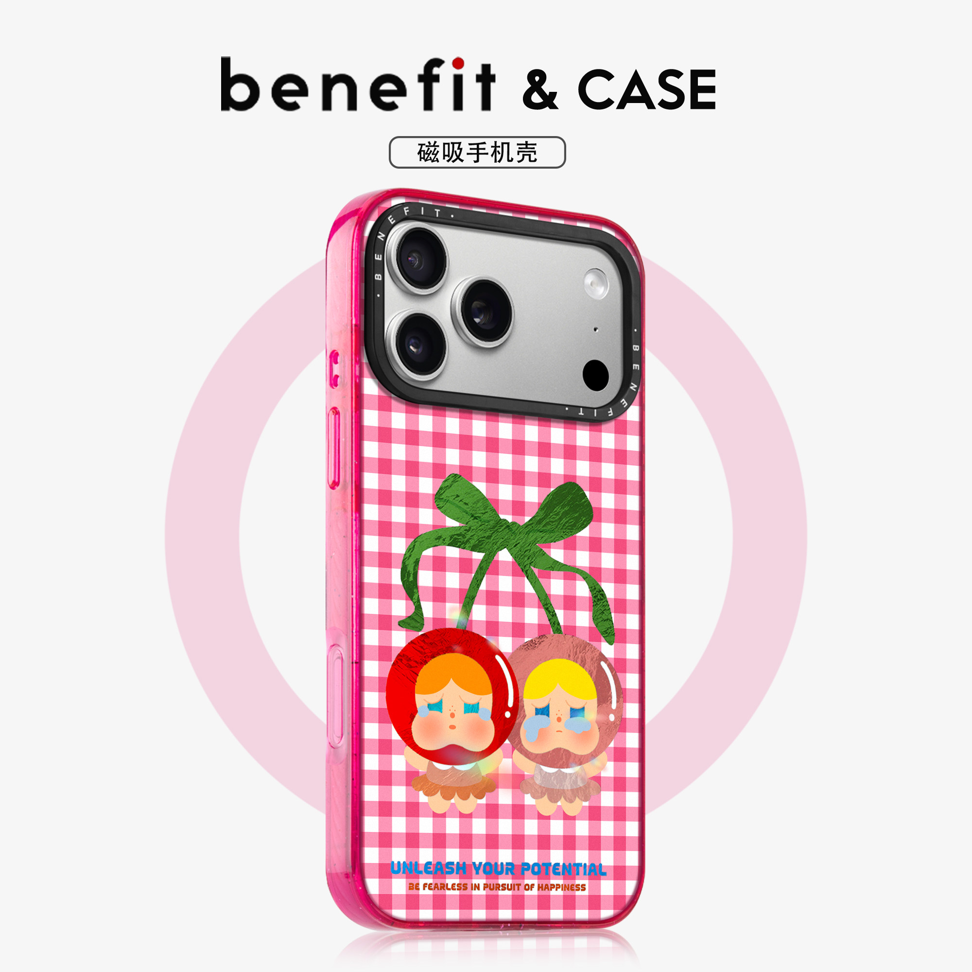 benefit粉色格纹樱桃哭泣女孩17适用于iphone16promax苹果15PRO磁吸手机壳13新款14防摔冰川纹12彩色哭边框娃