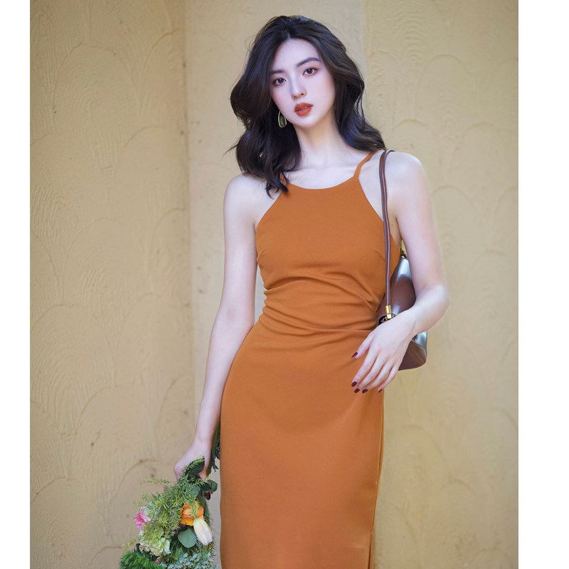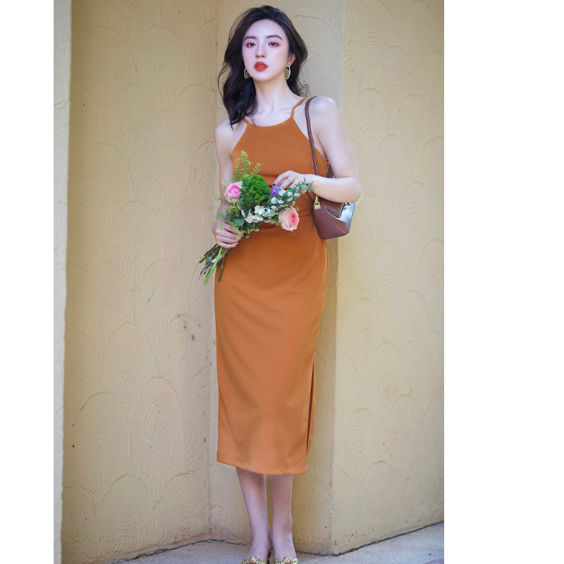 【papi同款】半练带胸垫吊带裙纯欲气质挂脖连衣裙黑裙子粉色长裙