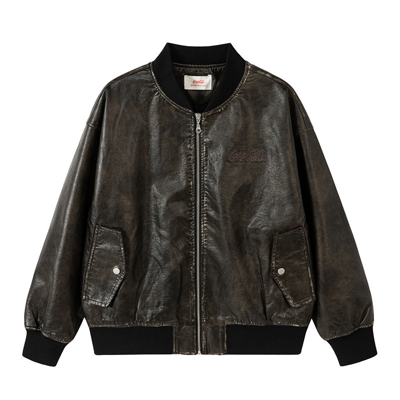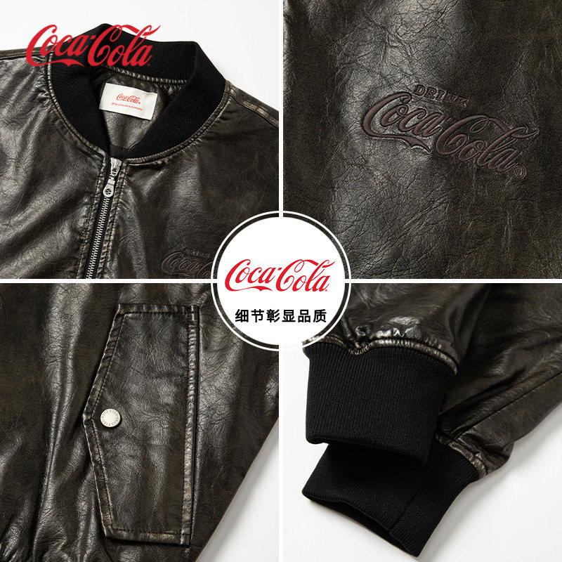 【商场同款】Coca-Cola可口可乐 做旧水洗Pu皮Logo刺绣防风棒球服