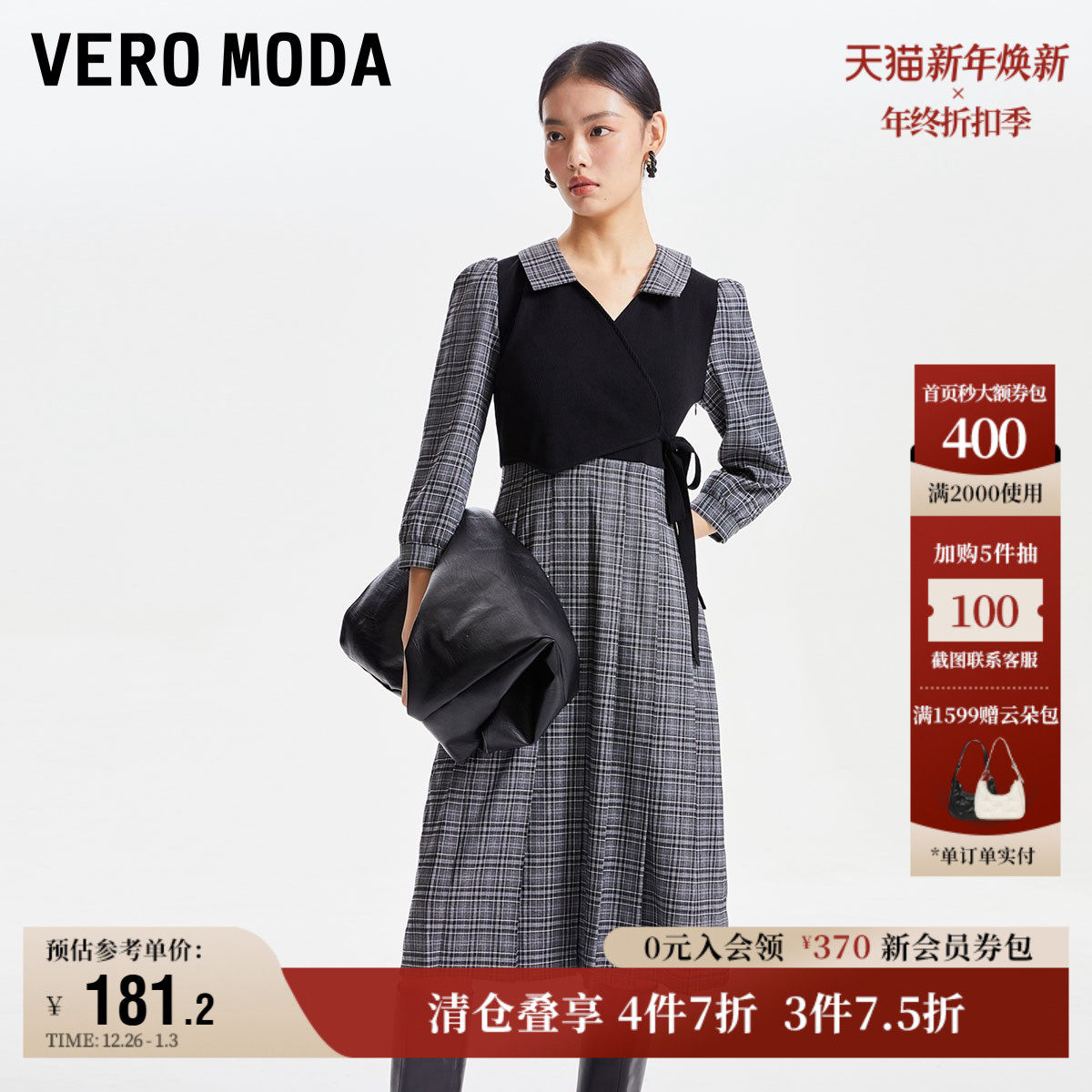 Vero Moda奥莱连衣裙子秋冬清仓格纹百褶长裙泡泡袖针织拼接女