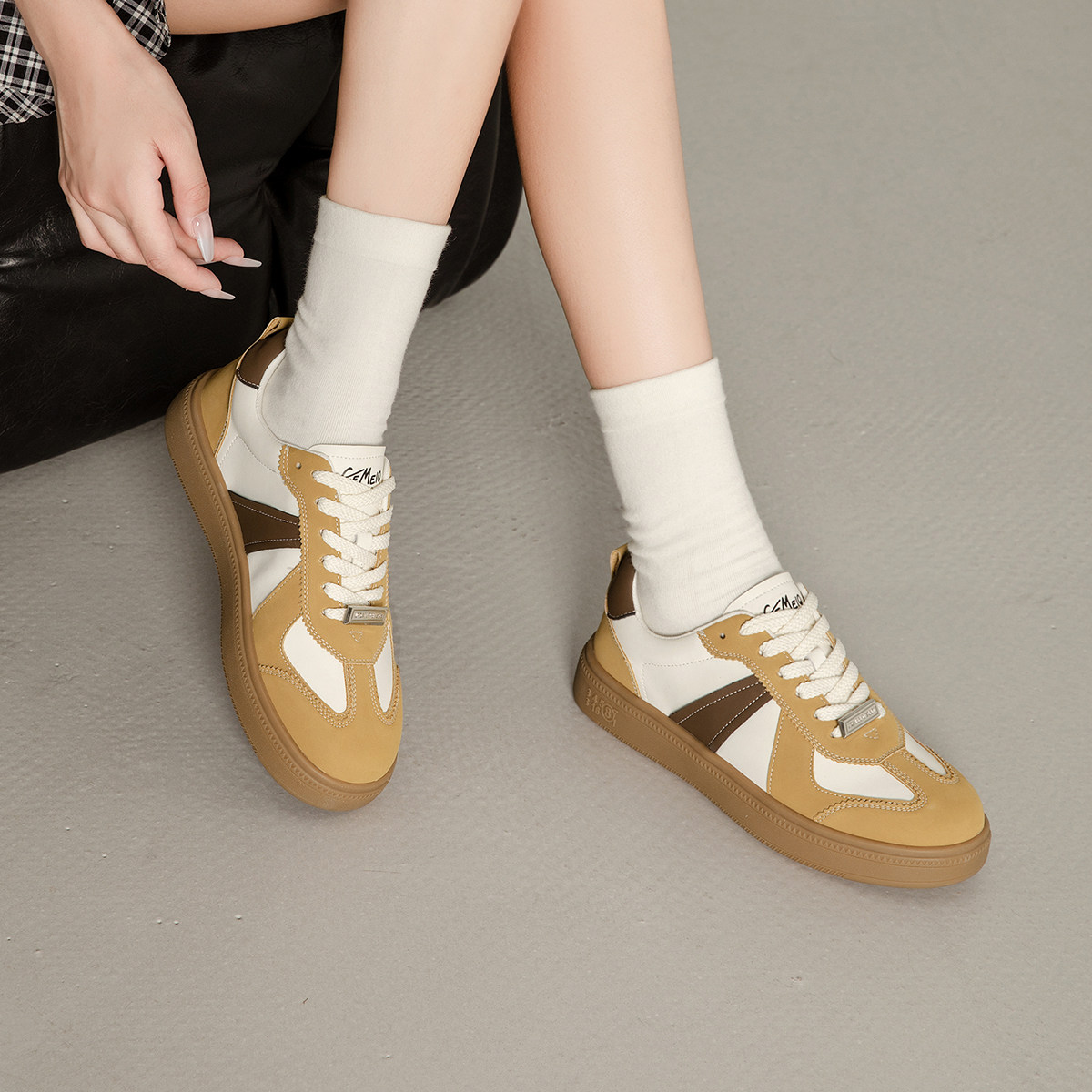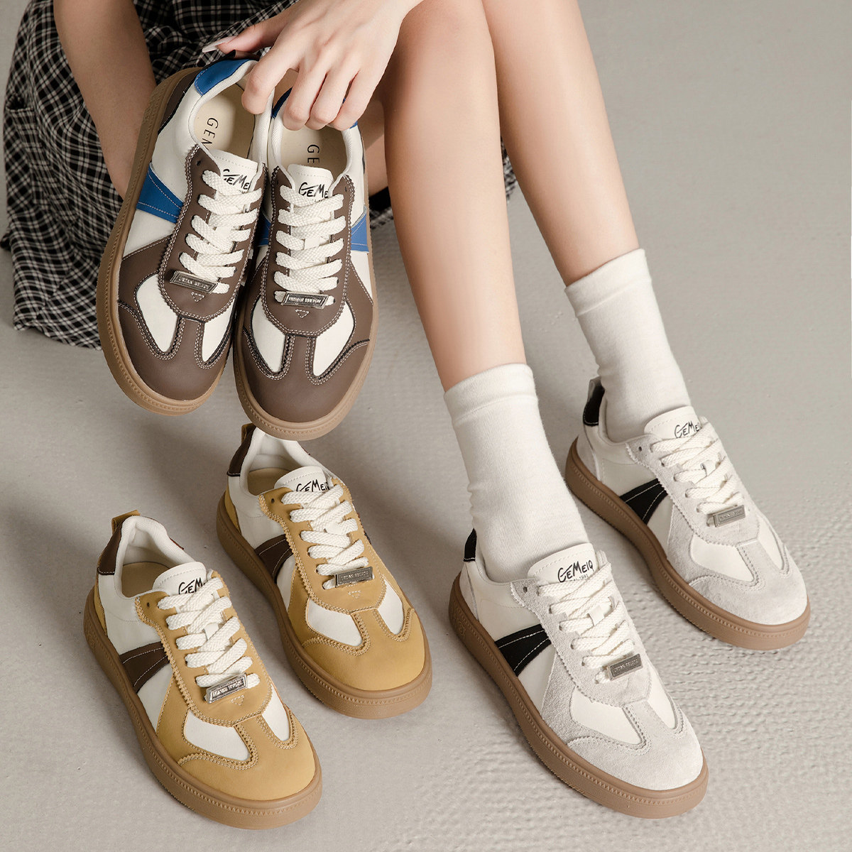 戈美其真皮板鞋女款平底舒适春季新款韩版百搭系带德训鞋小白鞋子