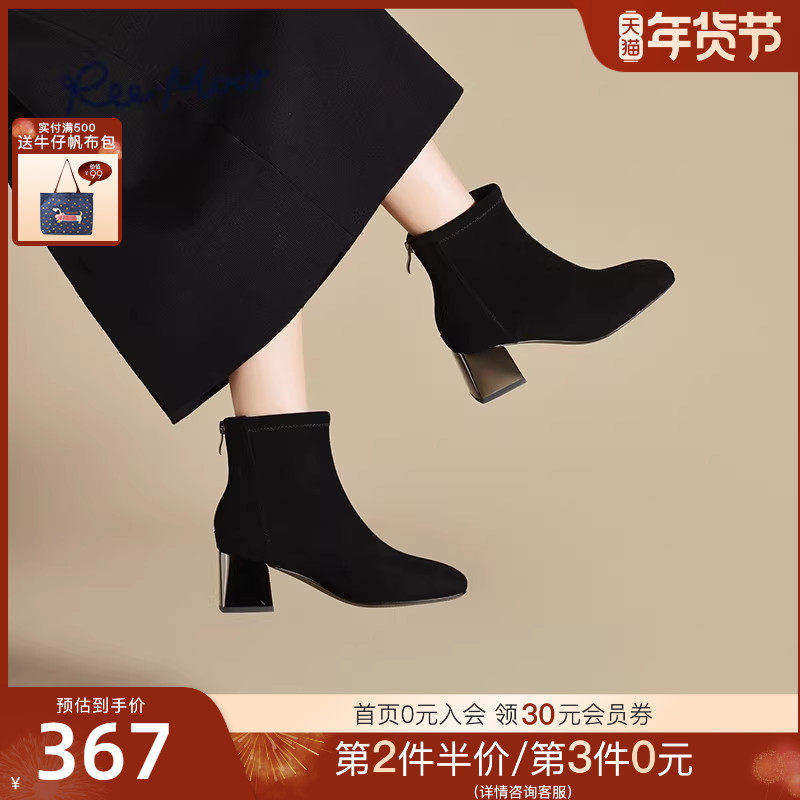 REEMOOR睿慕25新款粗跟时装靴女复古绒面方头中跟短靴