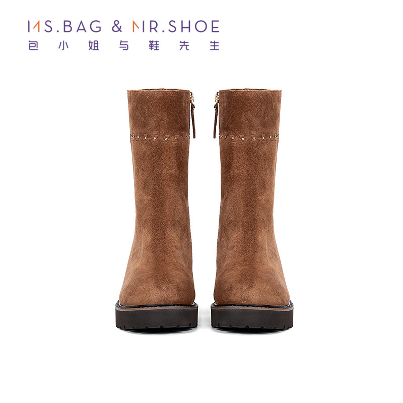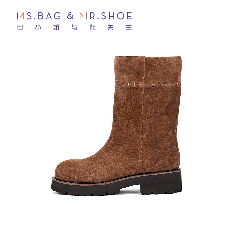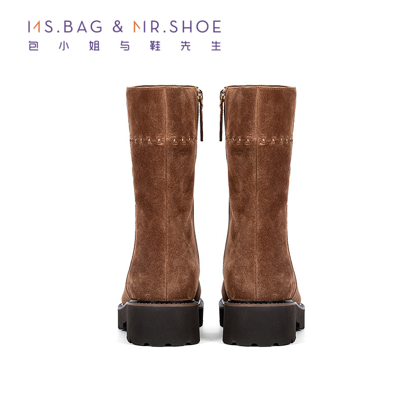 包小姐与鞋先生2025年冬季新品穿牛反绒皮工艺厚底短筒靴女254169