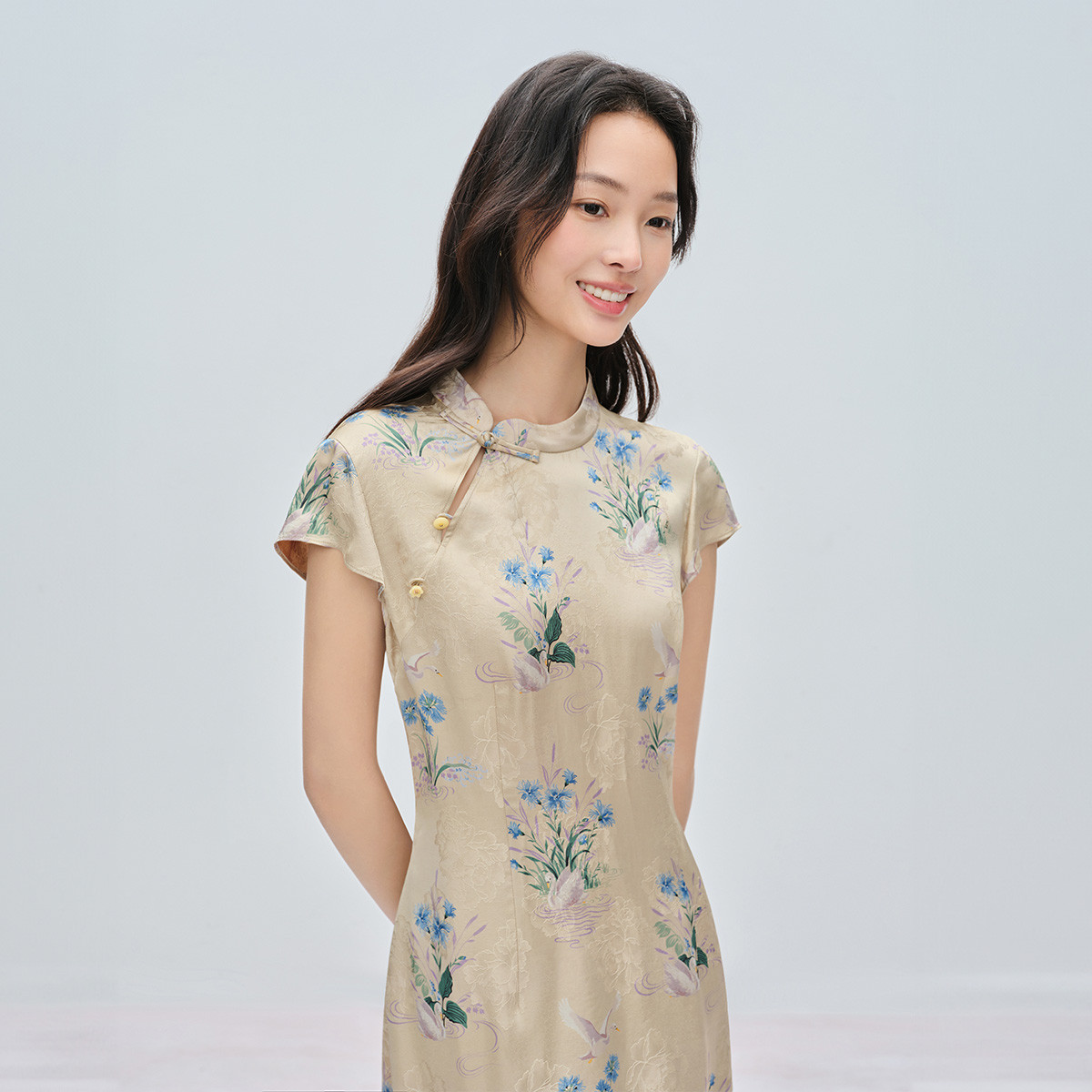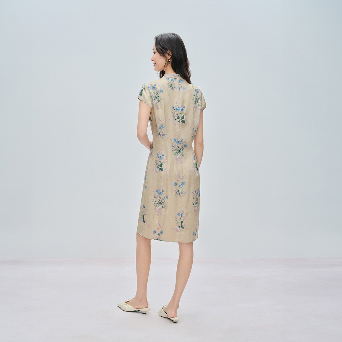 【满池娇】naivee26夏新款新中式镂空立领印花仿香云纱旗袍连衣裙