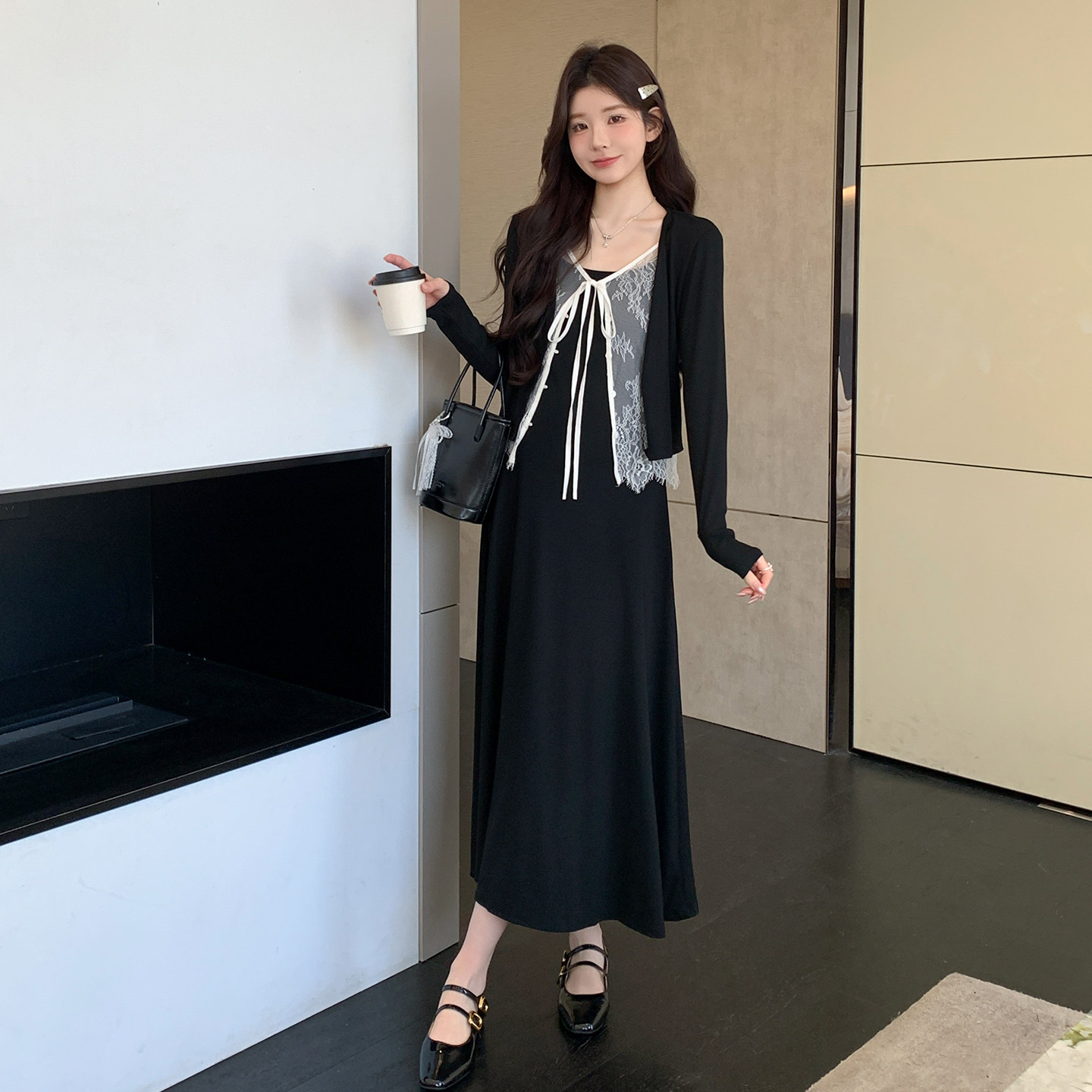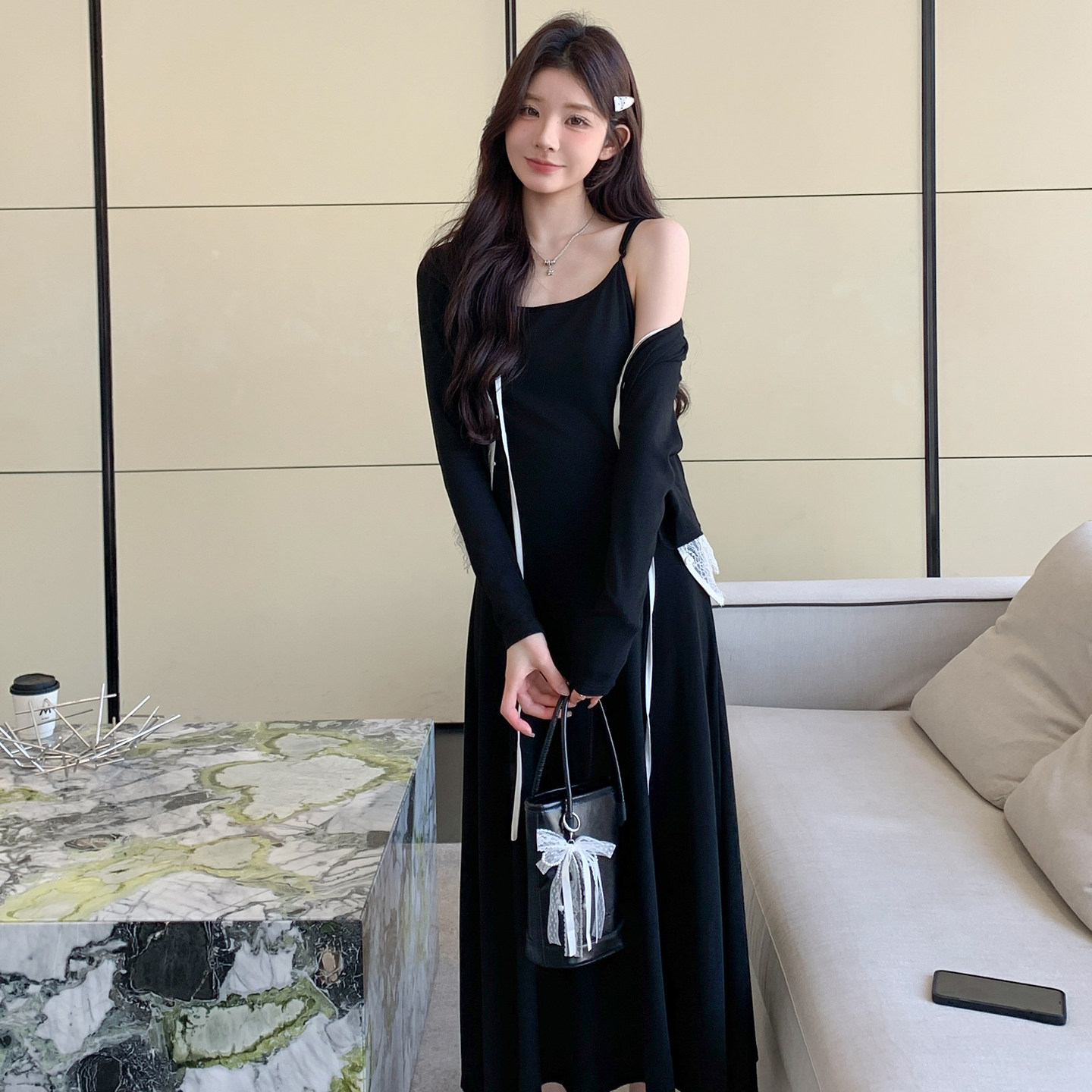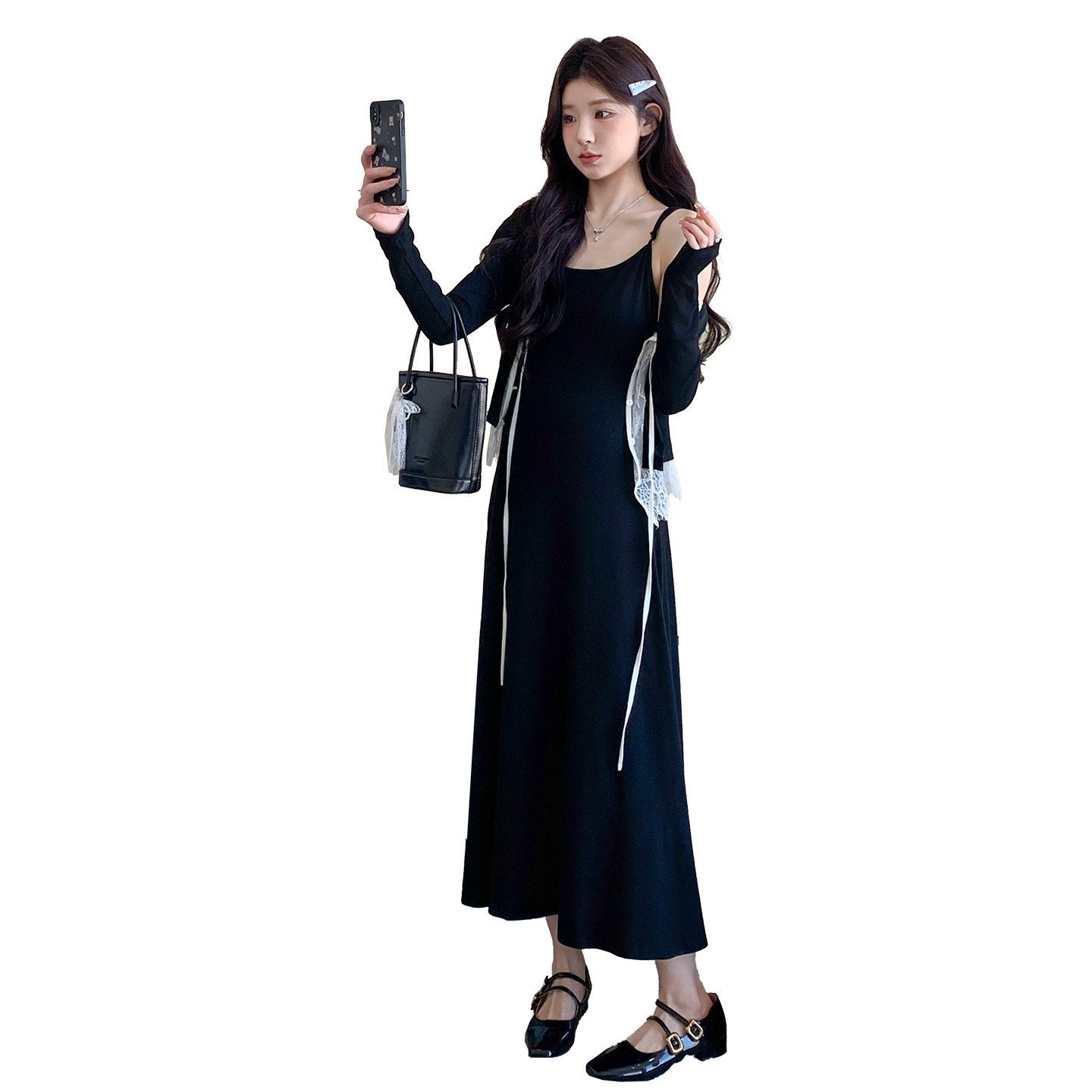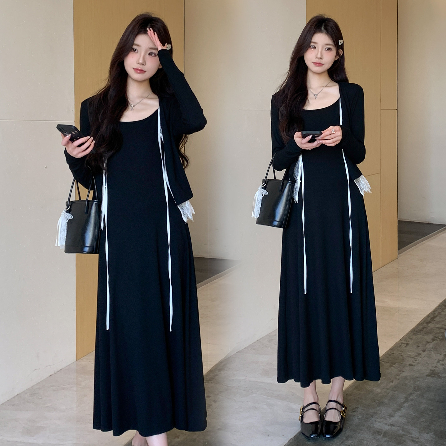 婧麒孕妇连衣裙套装新款孕妇春装孕期孕妇裙法式吊带裙蕾丝开衫女