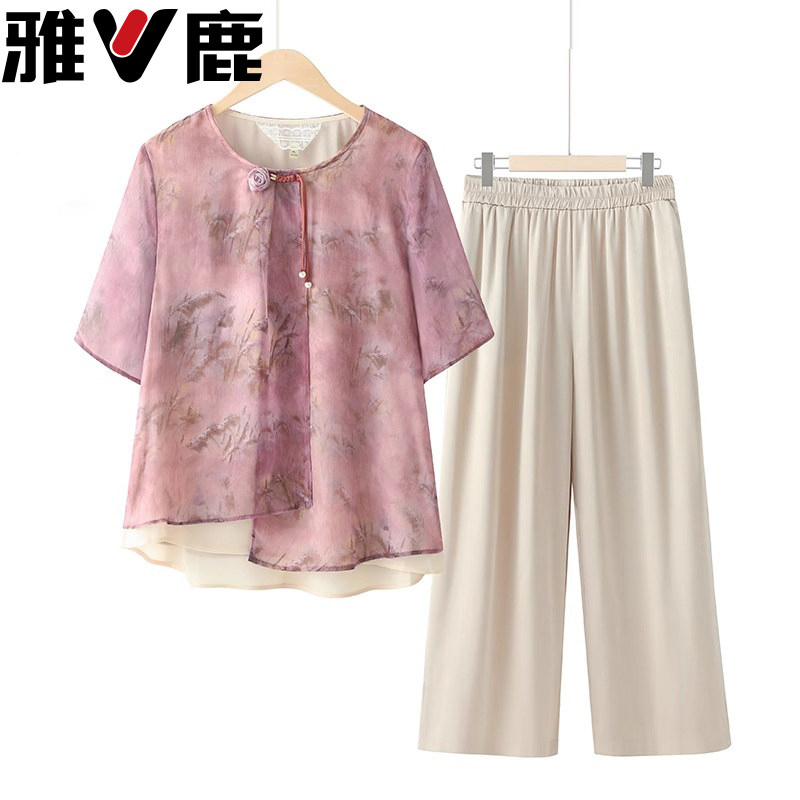 雅鹿妈妈夏装新款套装中老年人女装短袖奶奶夏季衣服雪纺T恤洋气