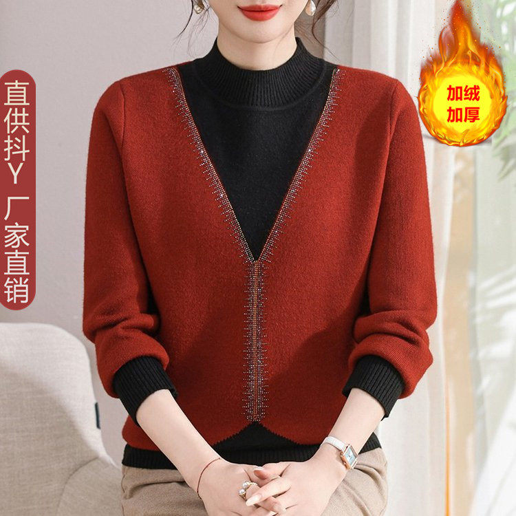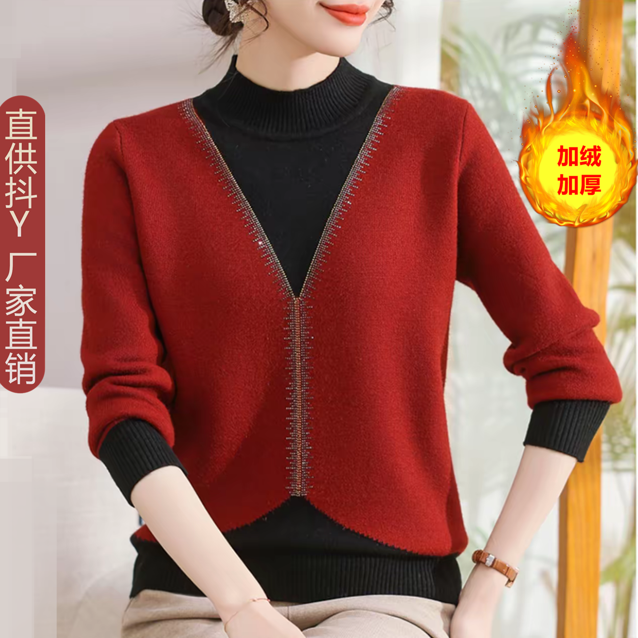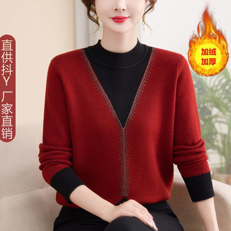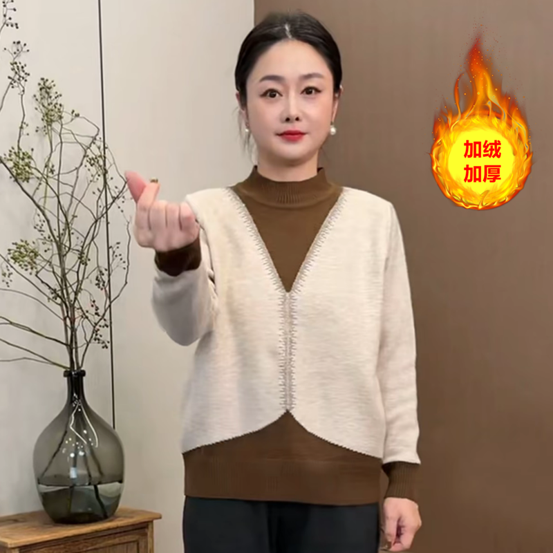2025新款假两件针织衫妈妈装秋冬加绒加厚毛衣中老年女装保暖上衣