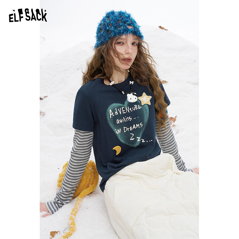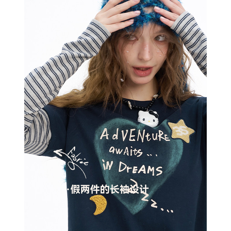 妖精的口袋假两件条纹拼接长袖t恤女2025冬季新款设计感内搭上衣