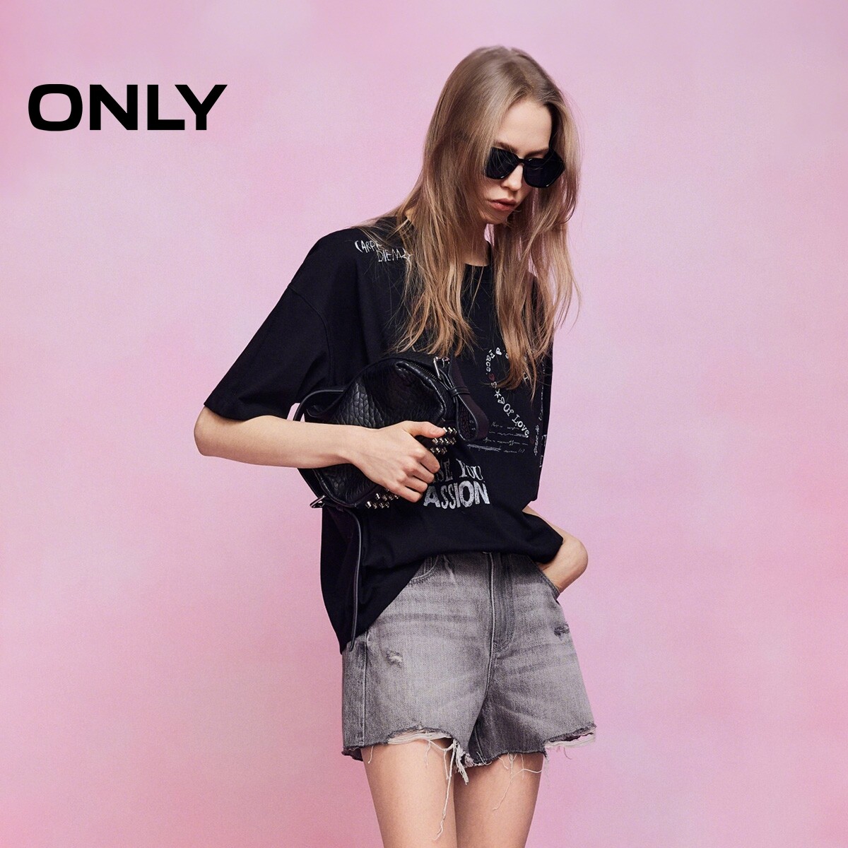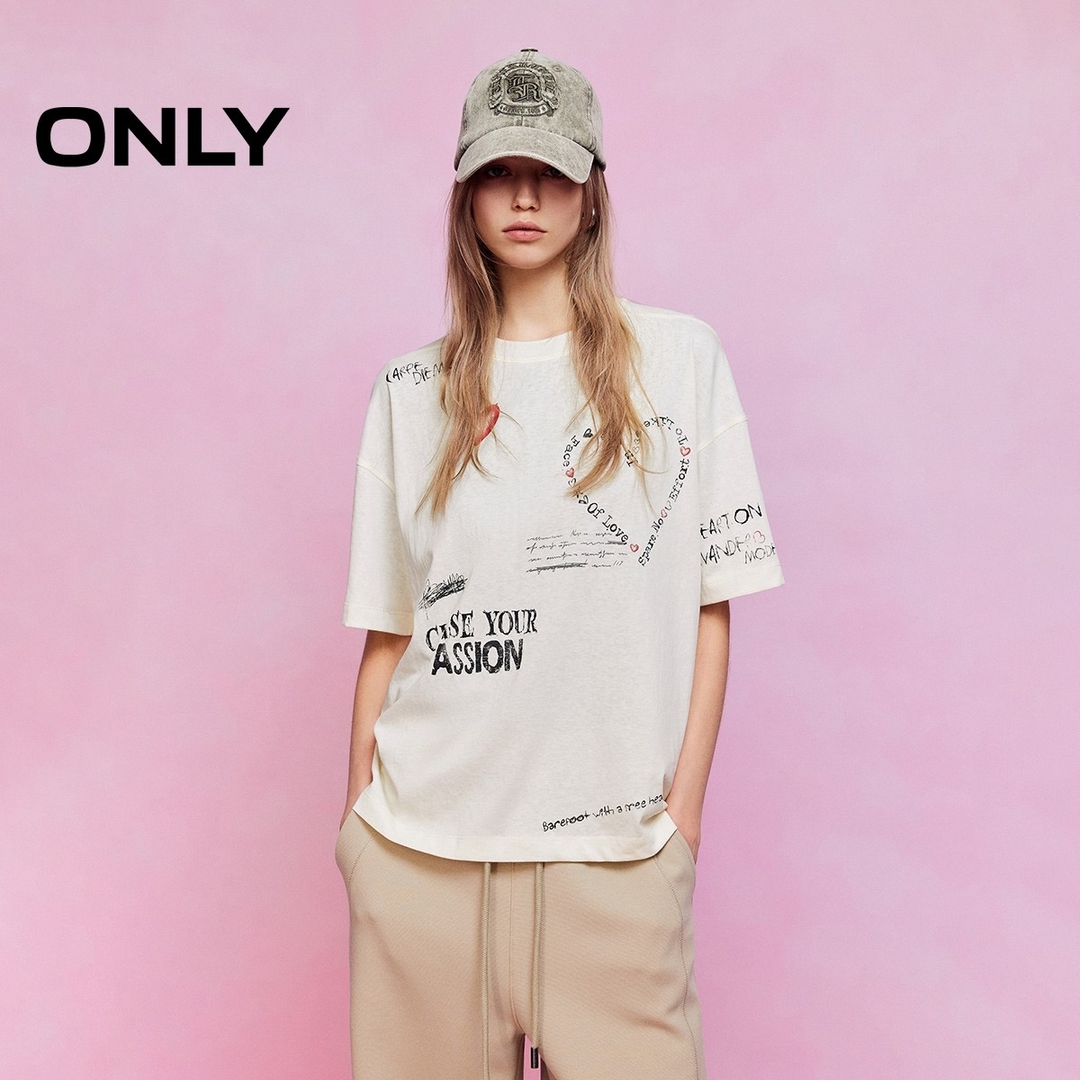 ONLY2026春季新款艺术感涂鸦印花罗纹领口宽松落肩短袖上衣T恤女