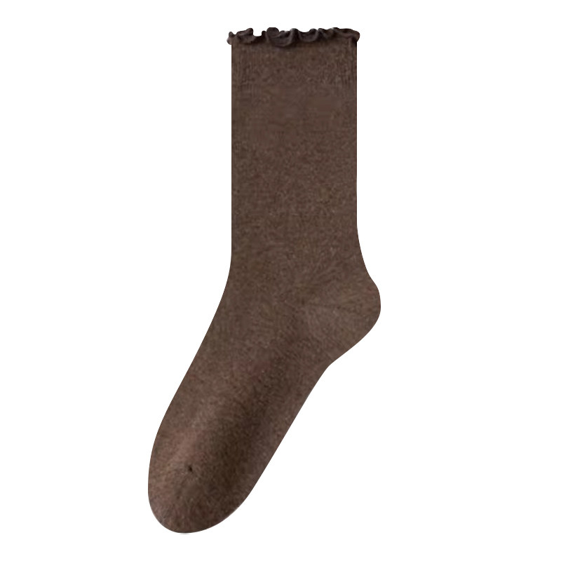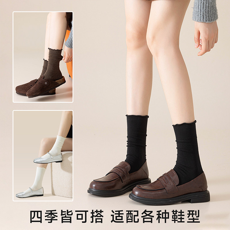 木耳边堆堆袜子女款春秋季纯色中筒棉袜配小皮鞋棕咖黑色无骨长袜