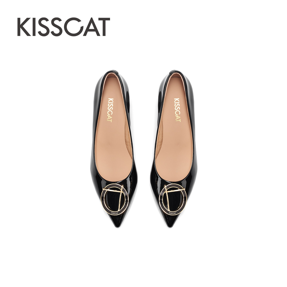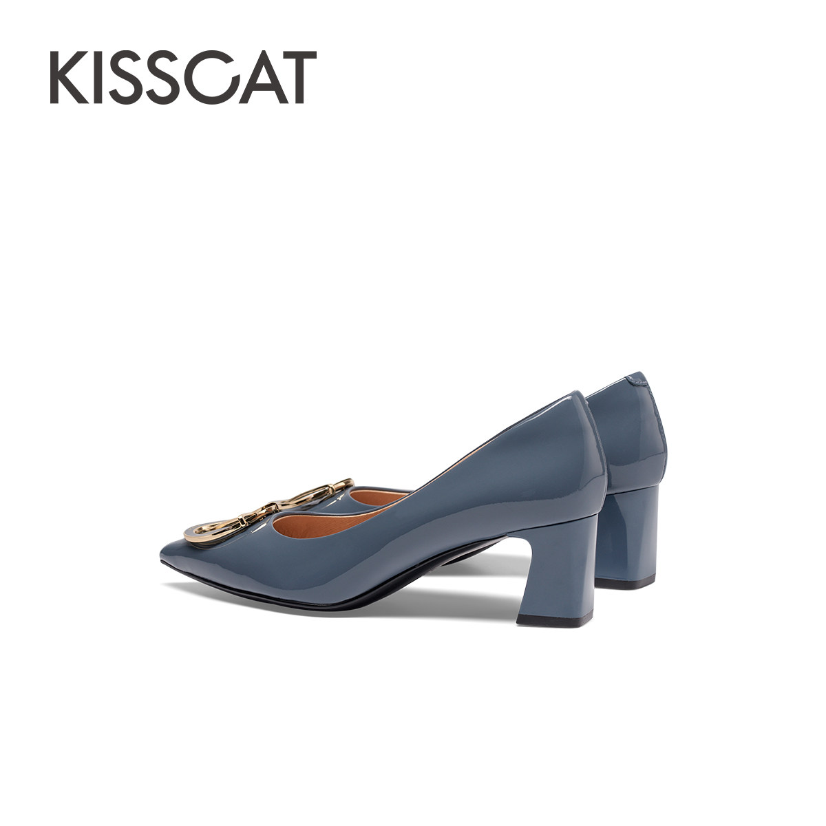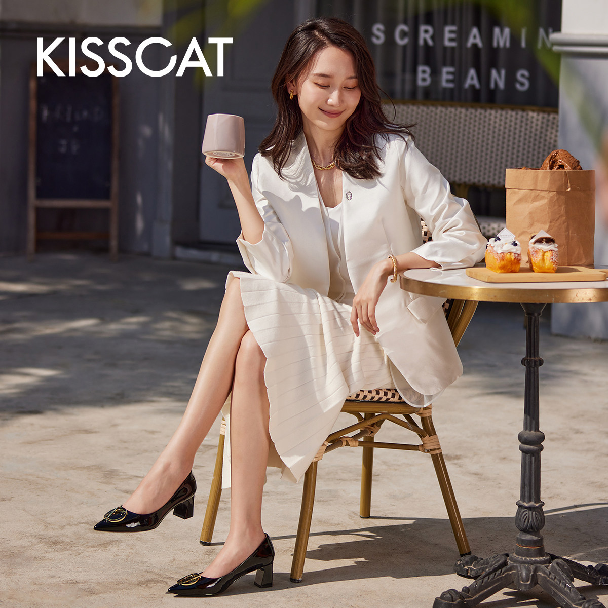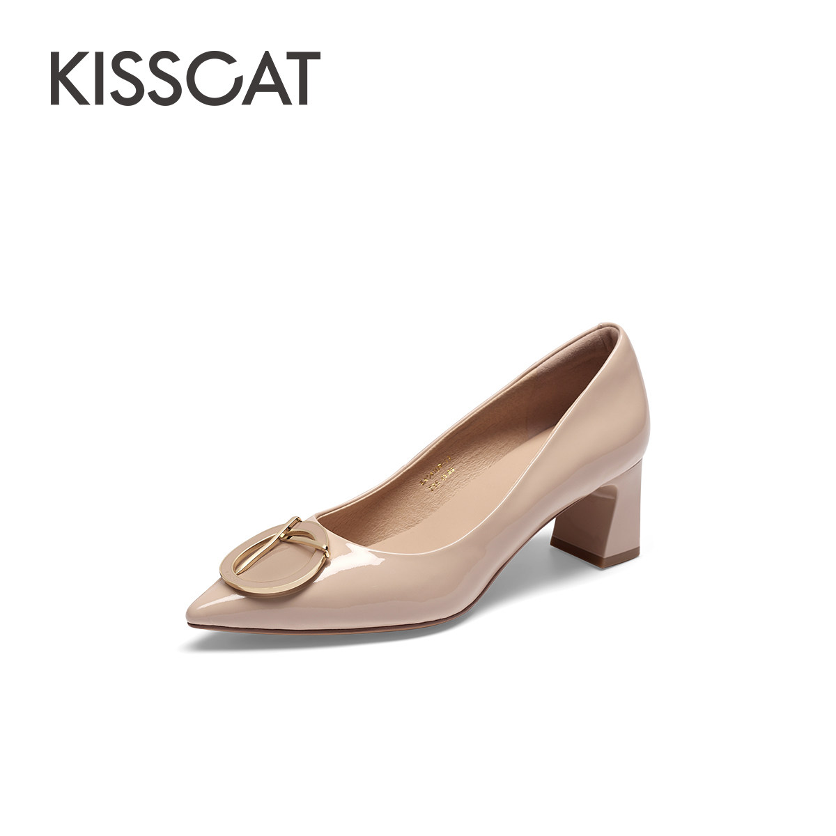 KISSCAT接吻猫[律政佳人]秋季新款真皮尖头粗跟法式高跟单鞋女