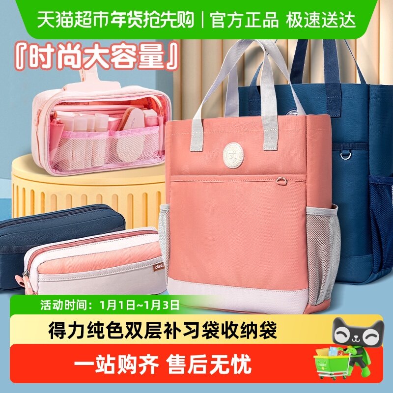 得力笔袋双层补习袋牛津布收纳袋大容量文具袋学生专用超轻面料