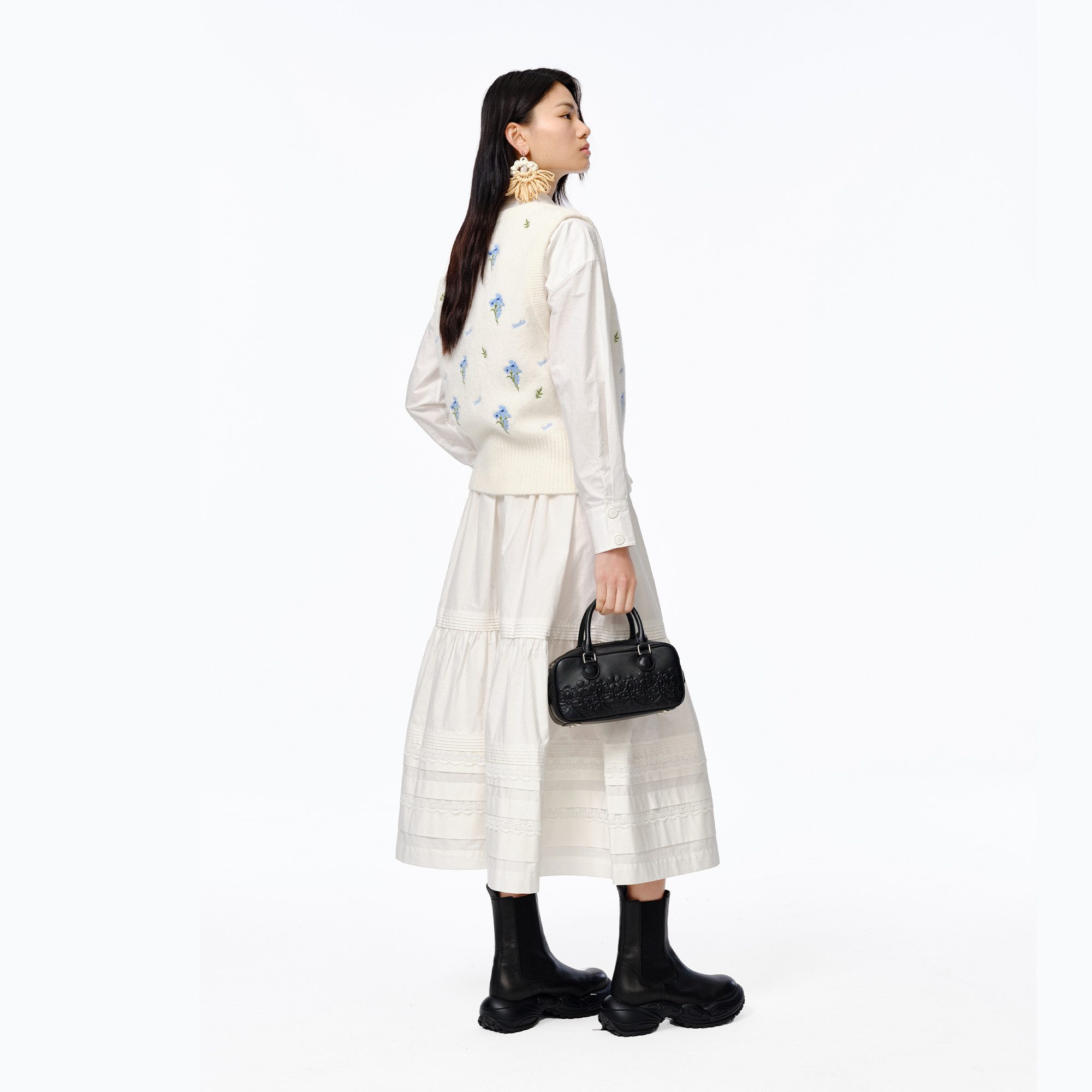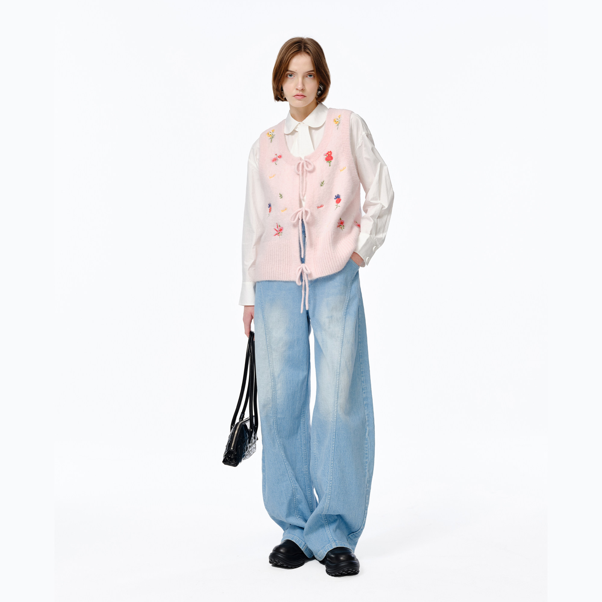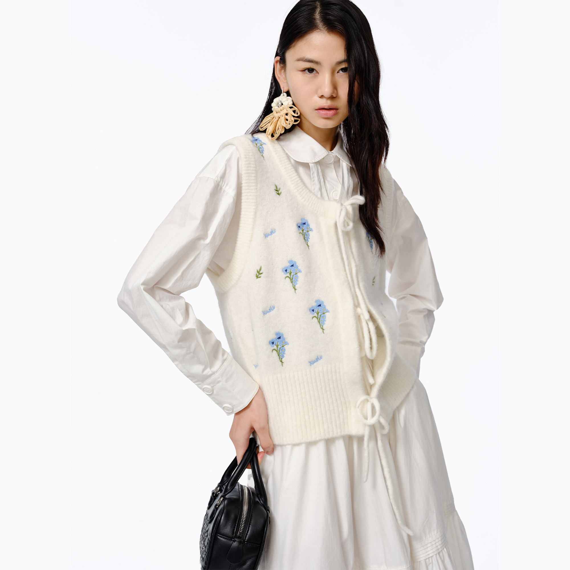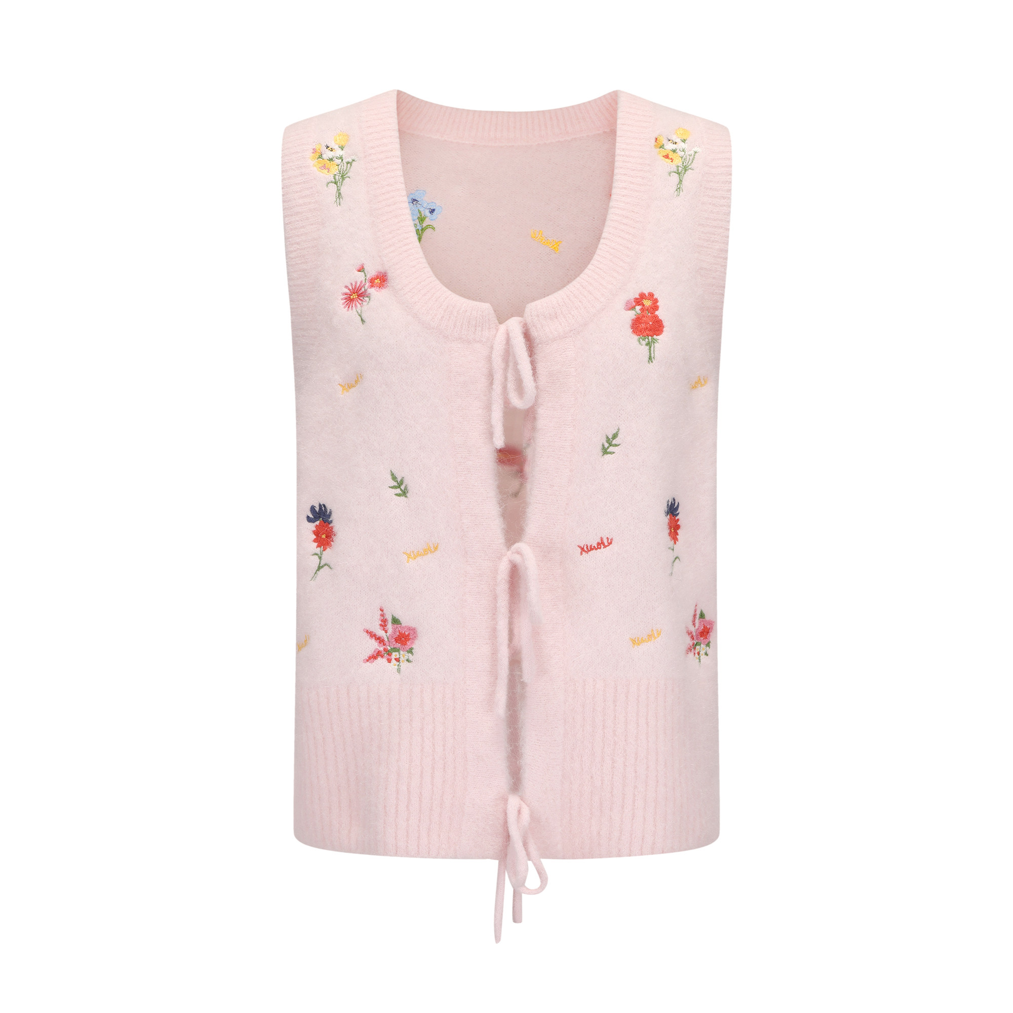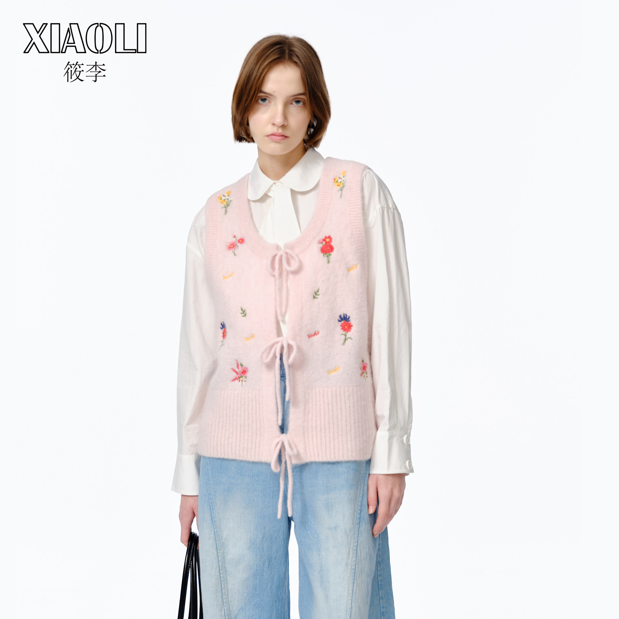 XIAOLI筱李 25春夏碎花刺绣贝贝羊驼毛针织宽松系带马甲女