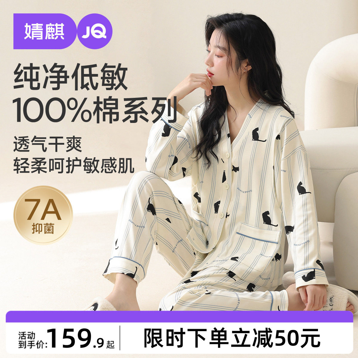 婧麒月子服纯棉十月份全棉吸汗产后孕妇睡衣哺乳喂奶待产家居服女