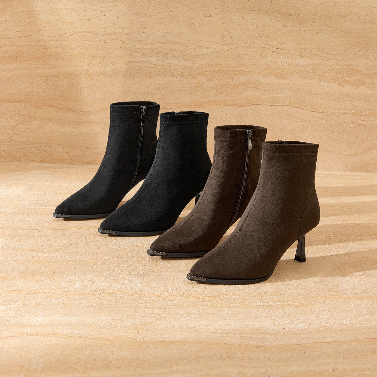 棕色靴子!小个子内增高7CM法式方头靴2025冬新款绒面粗跟短靴女