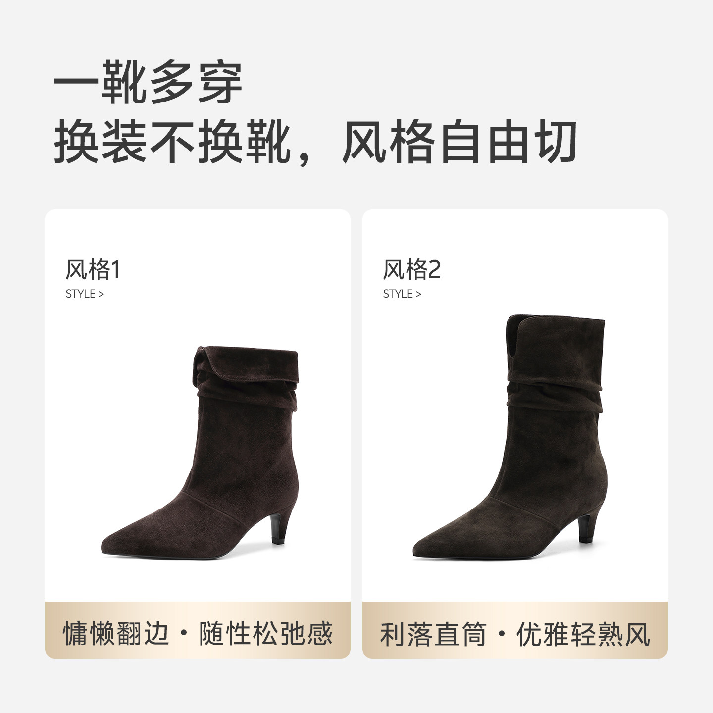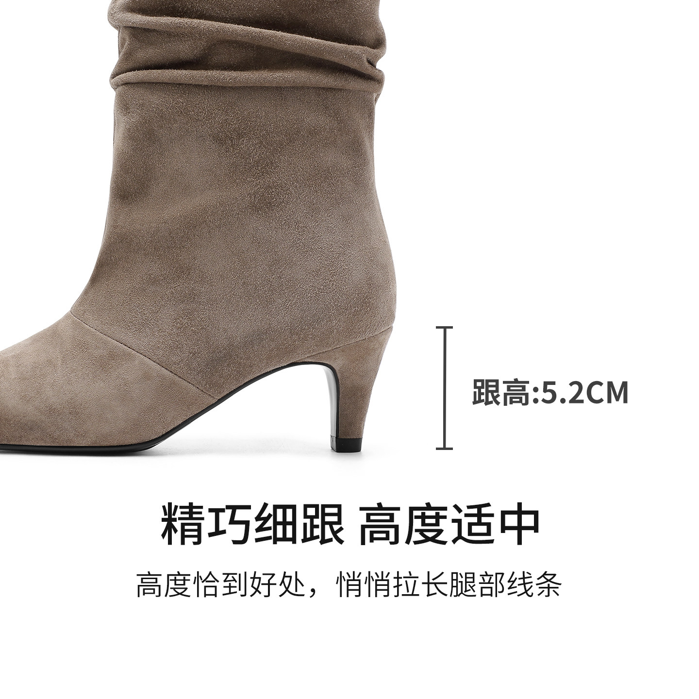 哈森气质绒面尖头高跟褶皱堆堆靴西部中筒靴女2025冬新款HA253417