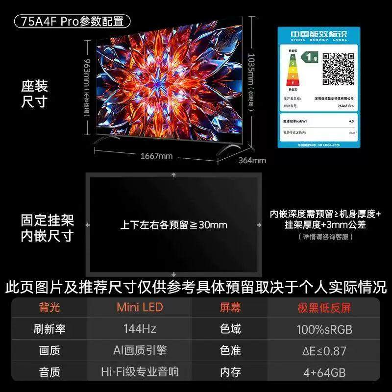 创维A4F Pro 75英寸低反屏Mini LED电视机官方液晶平板 以旧换新