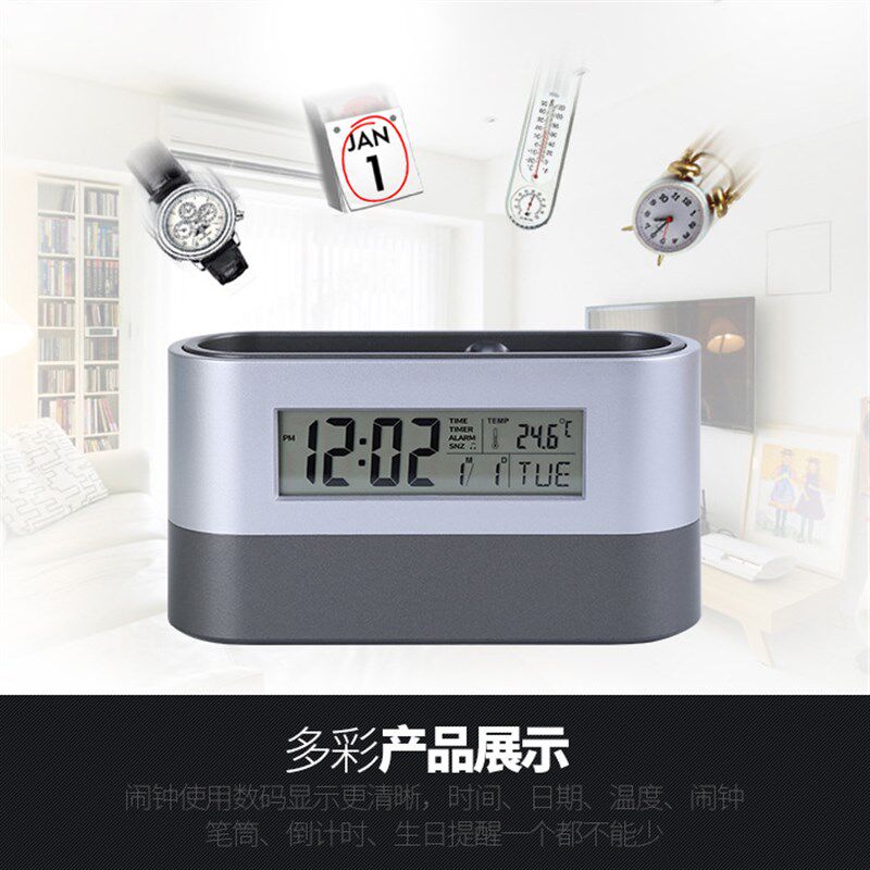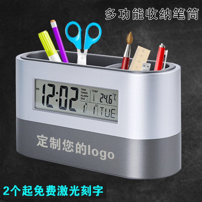 个性多功能分格收纳电子万年历桌面时钟笔筒企业礼品定制印字logo