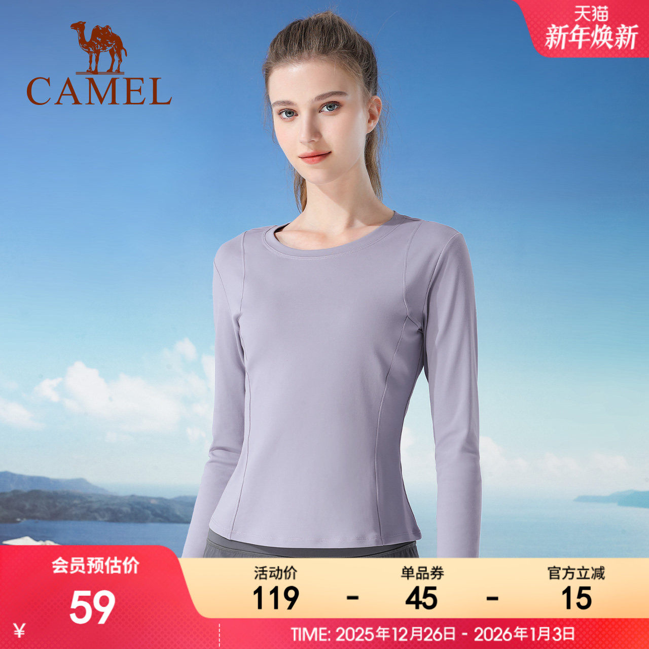 骆驼瑜伽长袖T恤女秋季新款薄绒保暖运动圆领修身纯色上衣打底衫