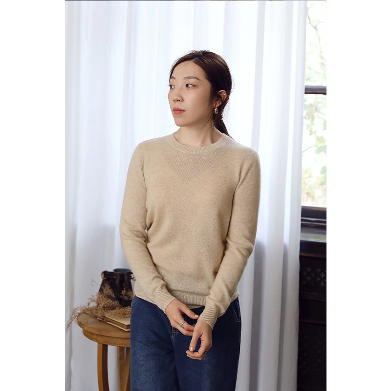 100%拉绒山羊绒+绵羊毛无缝一体亲肤柔软针织拉绒圆V领宽松打底衫