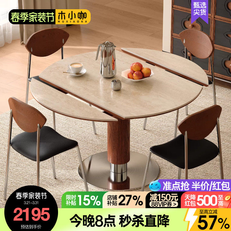 木小咖可伸缩实木岩板餐桌圆形中古客厅家用小户型维亚折叠餐桌椅
