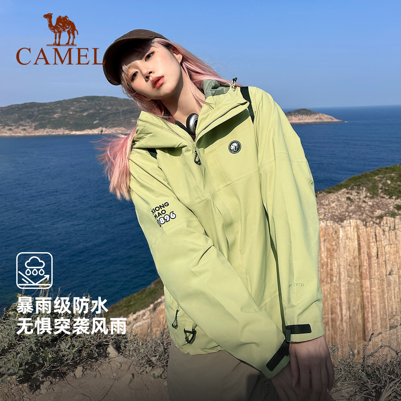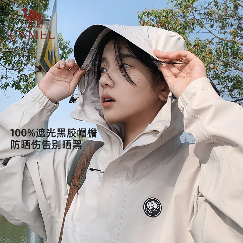 骆驼熊猫雨壳冲锋衣女外套新款2026春夏户外防风登山服青果绿色男