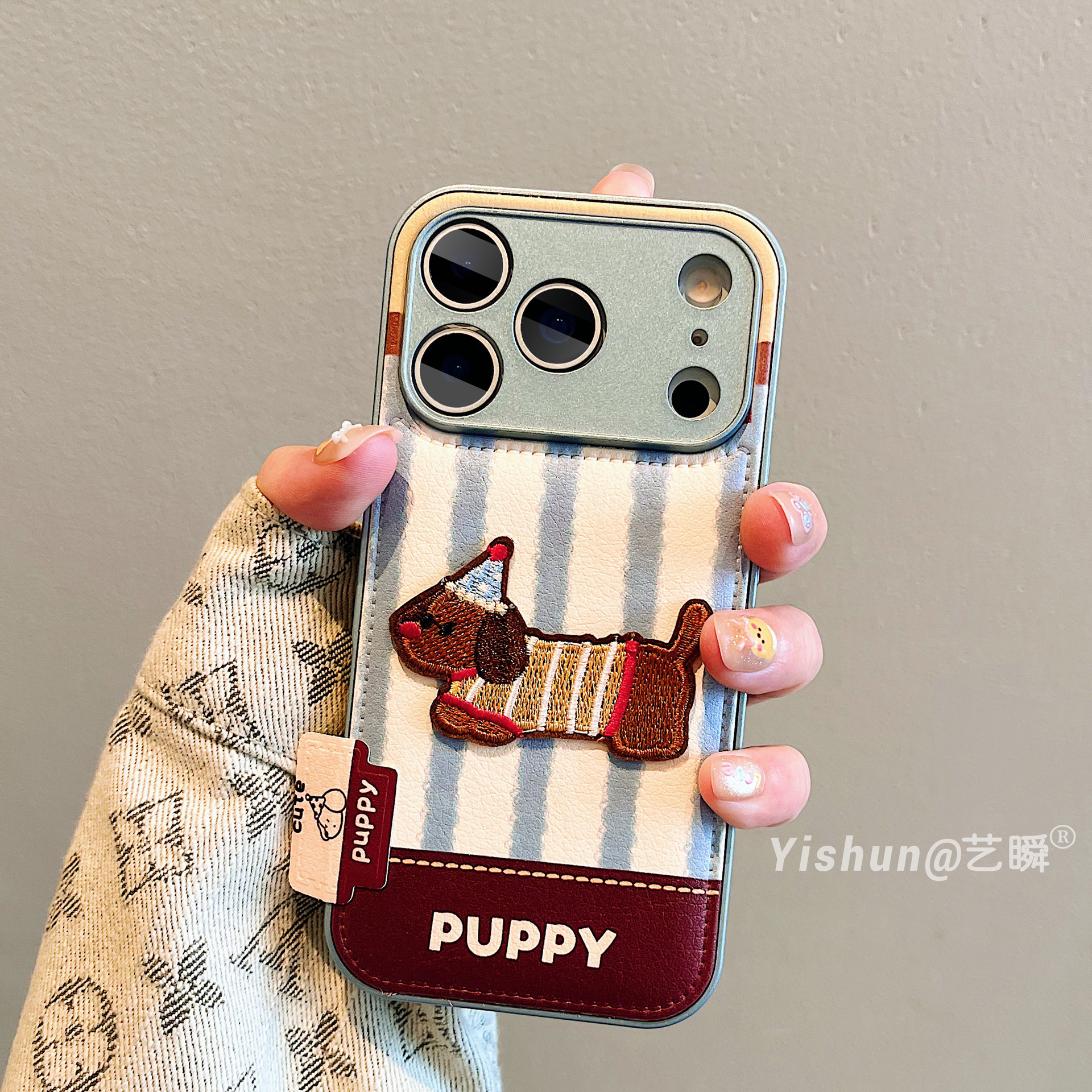 秋冬新款蓝白条纹三角帽腊肠狗适用iPhone17ProMax手机壳苹果16pro皮质鼓包13全包镜头15pro可爱14女款保护套