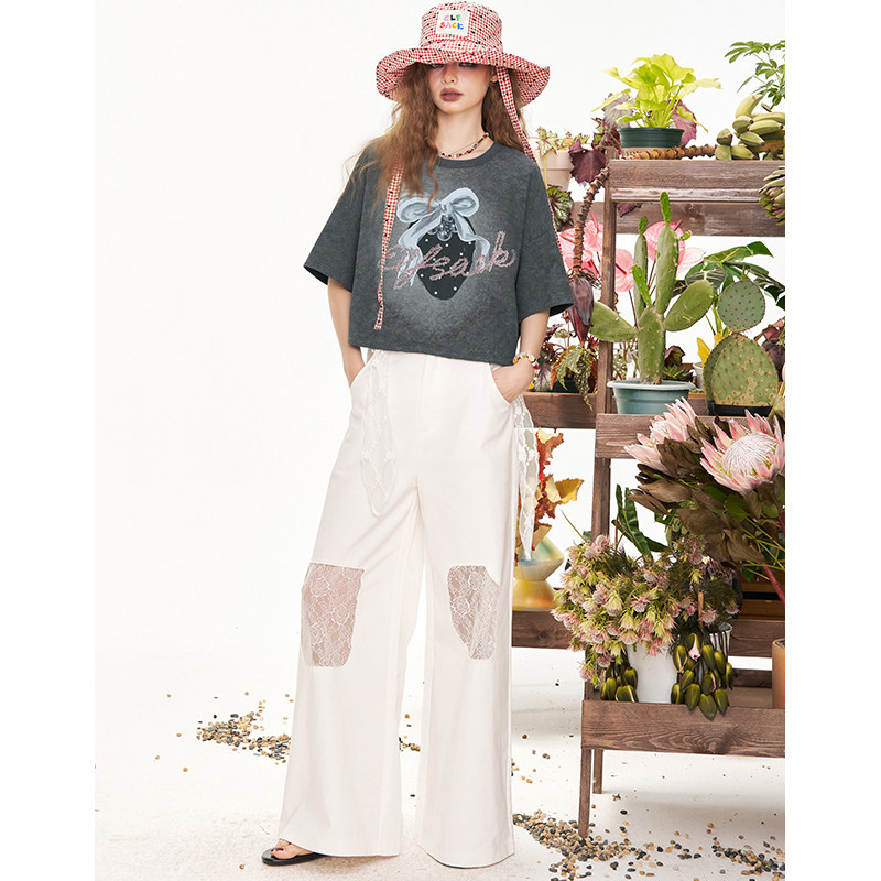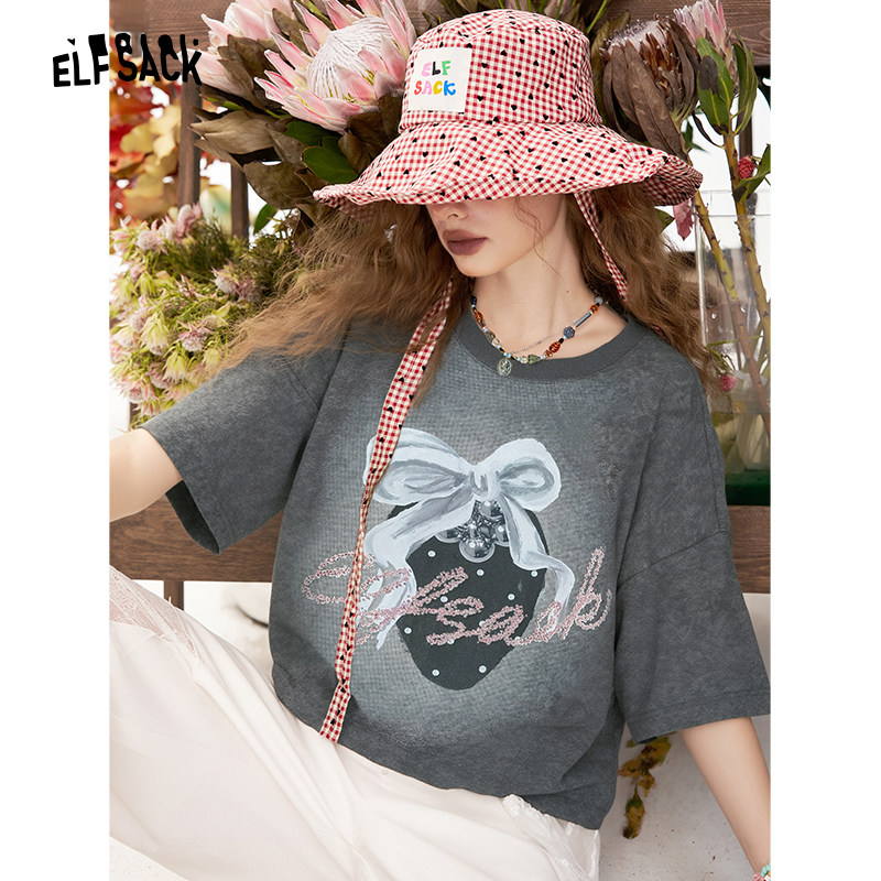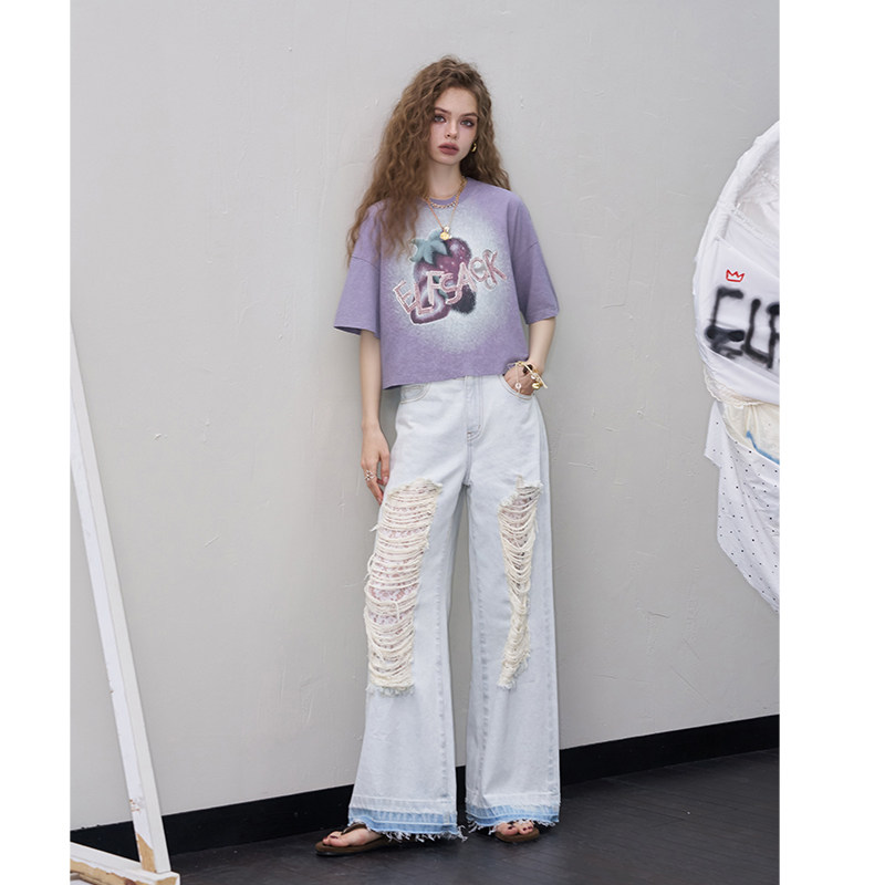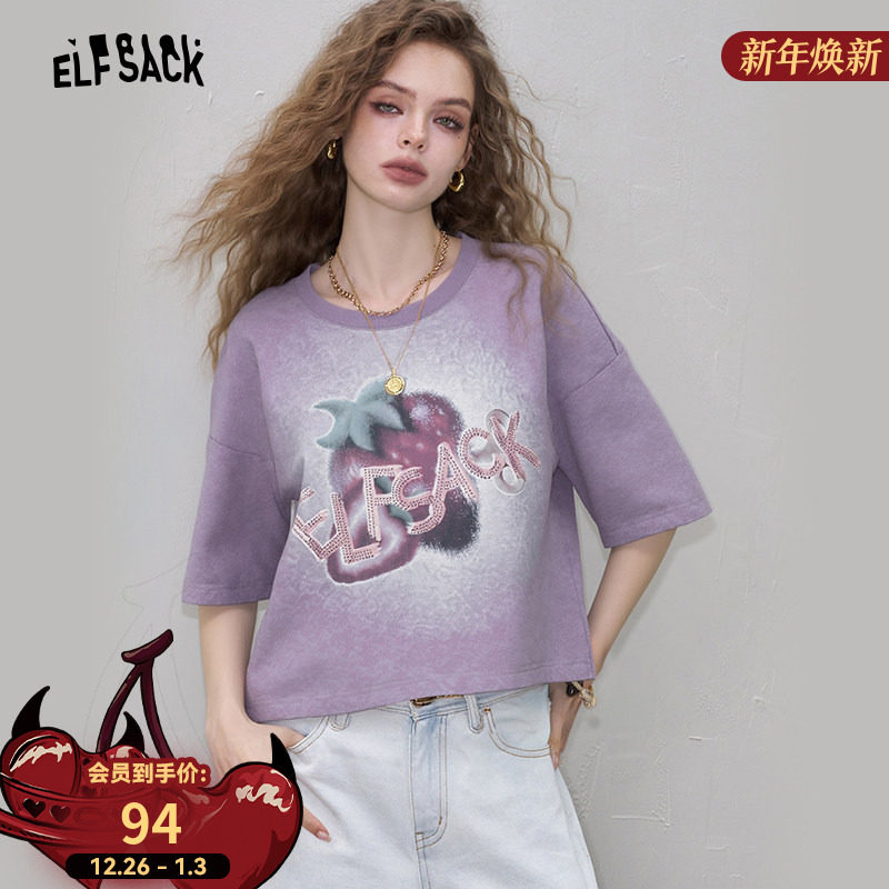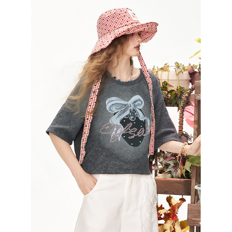 妖精的口袋紫色印花短袖t恤女2025夏季新款小众宽松休闲短款上衣