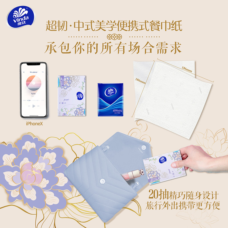 维达超韧抽纸便携式小方巾大包装手帕纸4层20抽10包提装卫生纸巾