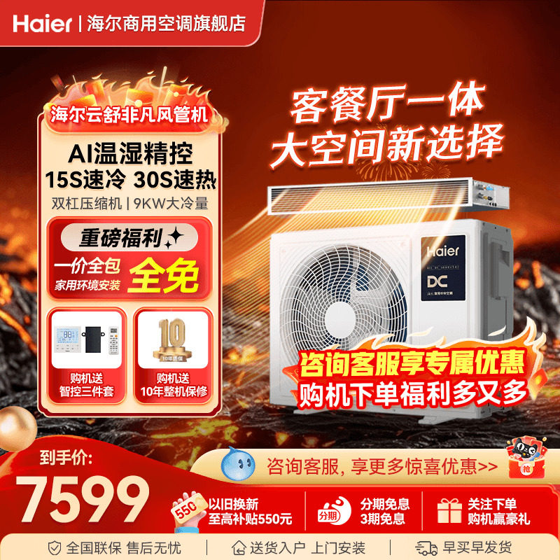 海尔中央空调3匹4匹风管机一拖一客厅家用一级能效非凡官方旗舰店